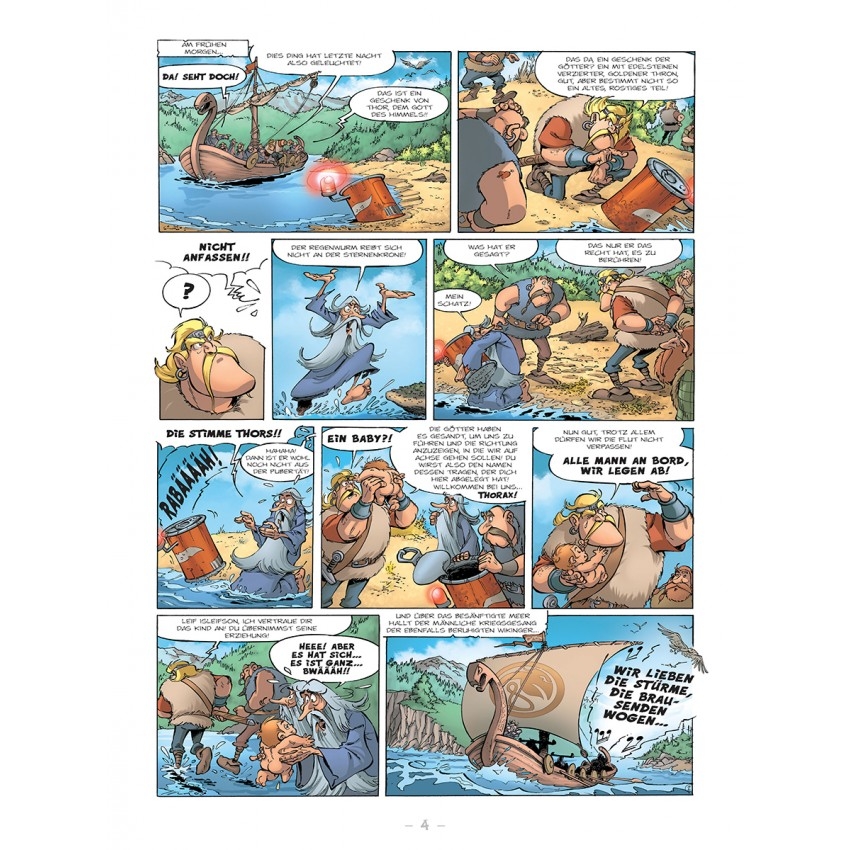 Eine versprengte Wikingerschar stößt am Strand auf ein seltsames, vom Himmel gefallenes Behältnis, das sich schnell als Heulboje erweist – befindet sich doch ein Säugling darin, der offenbar Hunger hat. Schon mal irgendwo gesehen? Gut möglich, aber sicher nicht so. Vor einiger Zeit trafen sich nämlich Grzegorz Rosinski (»Thorgal«, »Der kleine Schninkel« etc.) und Michel Rodrigue (u. a. »Percy Pickwick«), und Rosinski scherzte bei der Gelegenheit, er würde demnächst ein Album der Schlümpfe zeichnen. Gut, setzte Rodrigue noch einen drauf, dann mache er eben den nächsten »Thorgal«. Gesagt, getan – hier ist nun das Resultat.