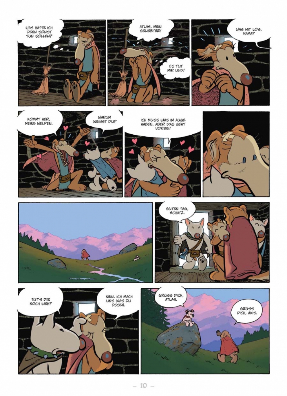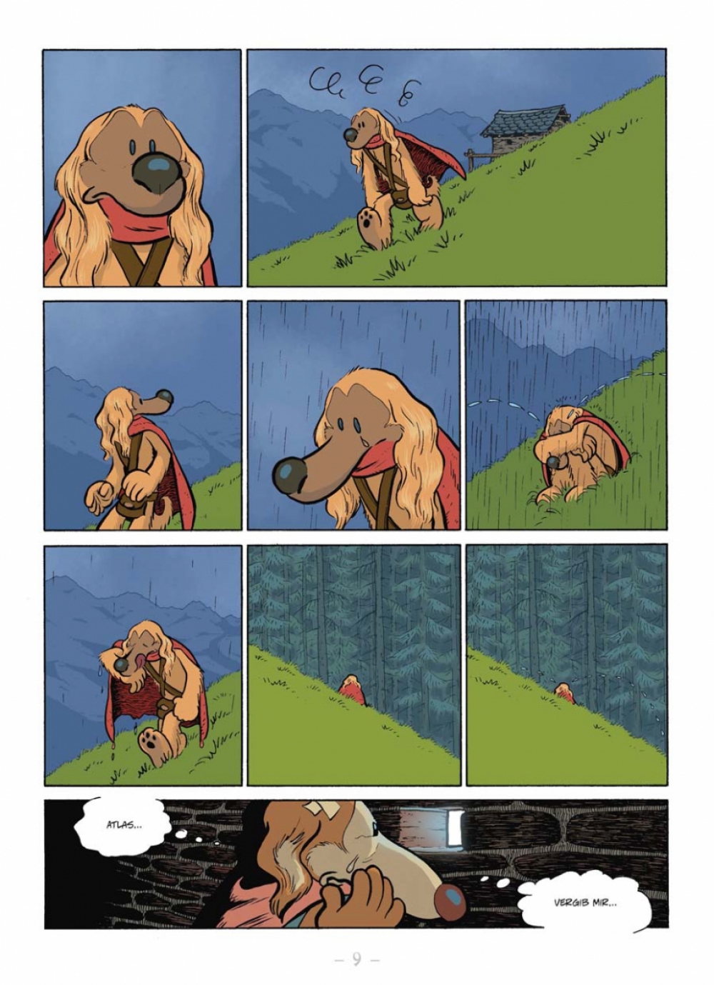 Die Welt von Pangea ähnelt eigentlich der unseren, bloß wie vor tausend Jahren. Man sieht kleine, mittelalterliche Dörfer, und irgendwo im Norden hausen Piraten, eine Art Wikinger, die diese Dörfer von Zeit zu Zeit plündern, niederbrennen und ihre Einwohner massakrieren oder verschleppen. Der große Unterschied zu unserer Welt: Sämtliche Bewohner Pangeas sind aufrecht gehende, sprechende Tiere, und das Sagen haben vornehmlich Hunde! So wie Atlas, ein pfiffiger, gewitzter Windhund, und sein bester Freund Axis, ein kleiner, drahtiger Terrier, der sich lieber auf seinen Instinkt verlässt. Durch Zufall bleiben die beiden als einzige verschont, als ihr Heimatdorf von fremden Räubern verwüstet wird, die obendrein die Schwester von Atlas entführen. Keine Frage, dass Atlas und Axis Rache schwören und sich auf die Verfolgung der Mordbrenner und Kidnapper begeben. Die einzigen Hinweise sind allerdings zunächst nur ein enormer Hundehaufen – und eine Wikingerfibel.
