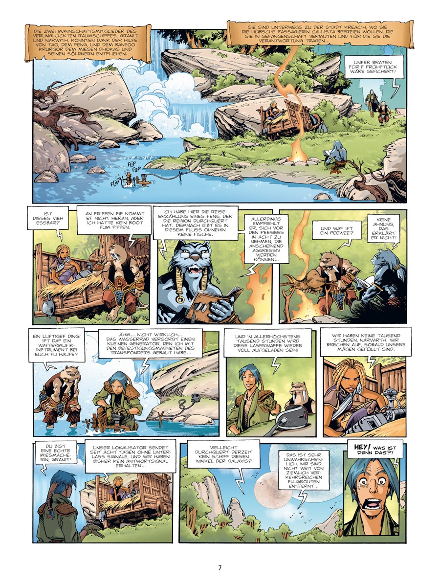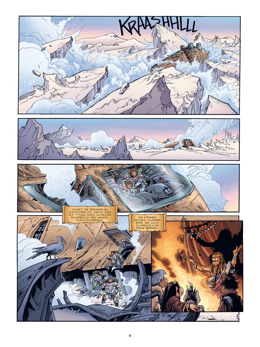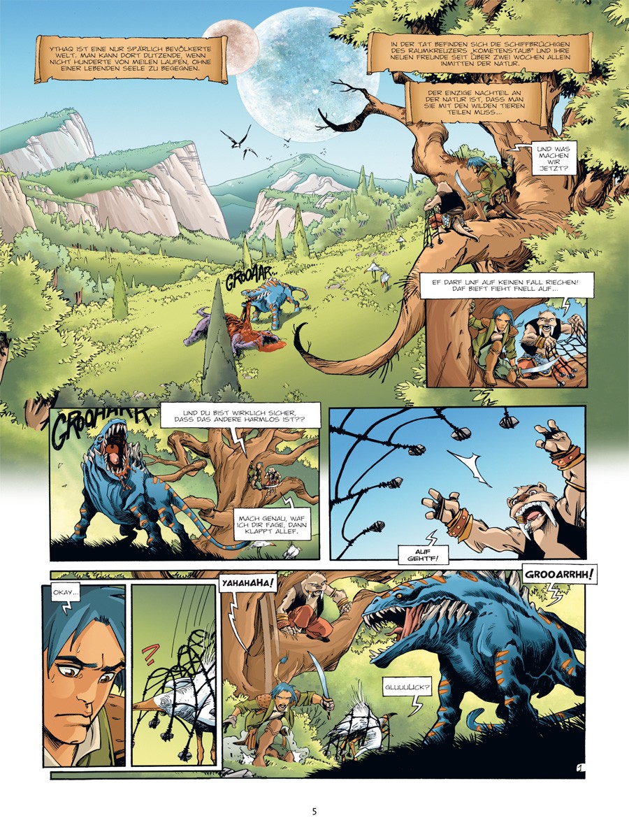 Für die Urlauber des Luxusraumschiffes Kometenstaub endet die Reise nicht am Strand ihrer Träume, sondern am Boden des unbekannten Planeten Ythaq. Dort wecken die unerschrockene Navigatorin Granit, Bordtechniker Narvarth und die zickige Passagierin Callista bei ihrer Suche nach weiteren Überlebenden rasch die Aufmerksamkeit der machthungrigen Markgräfin Ophyde – und deren skrupellose Schergen überbringen sicher keine Einladung zum Tee.