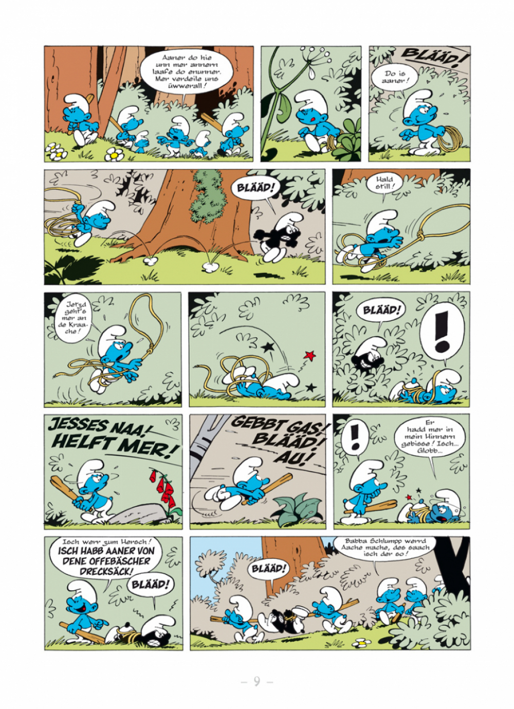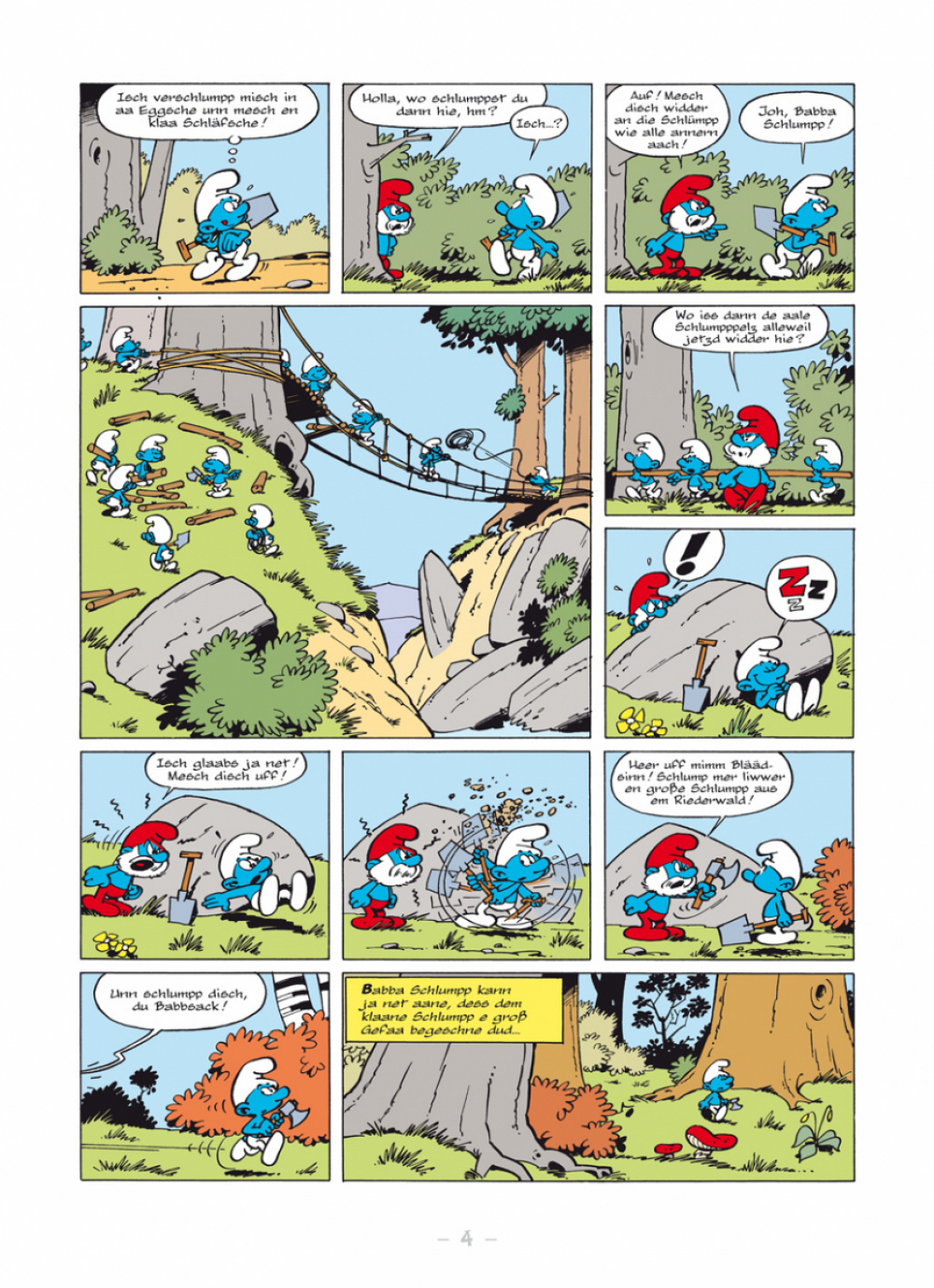 Midde im Spessard lebbe de Schlümpp, hunnerd klaane blaue Wichtl, gligglisch unn zufridde im Einklang mid sisch unn de Natur. Aangeführt vom weise Babba Schlumpp wubbe de Schlümpp alle Probleme un dorschkroize allemal die gemeine Plän vom Zorngiggel Gargamel, denn der macht immer werrer Jagd uff die. Als awwer irgendwann en schwazze Schlumpp in dene ihrer Midd auftaucht, is sogar de Babba Schlumpp neve de Kapp: Was is denn mid dem los?