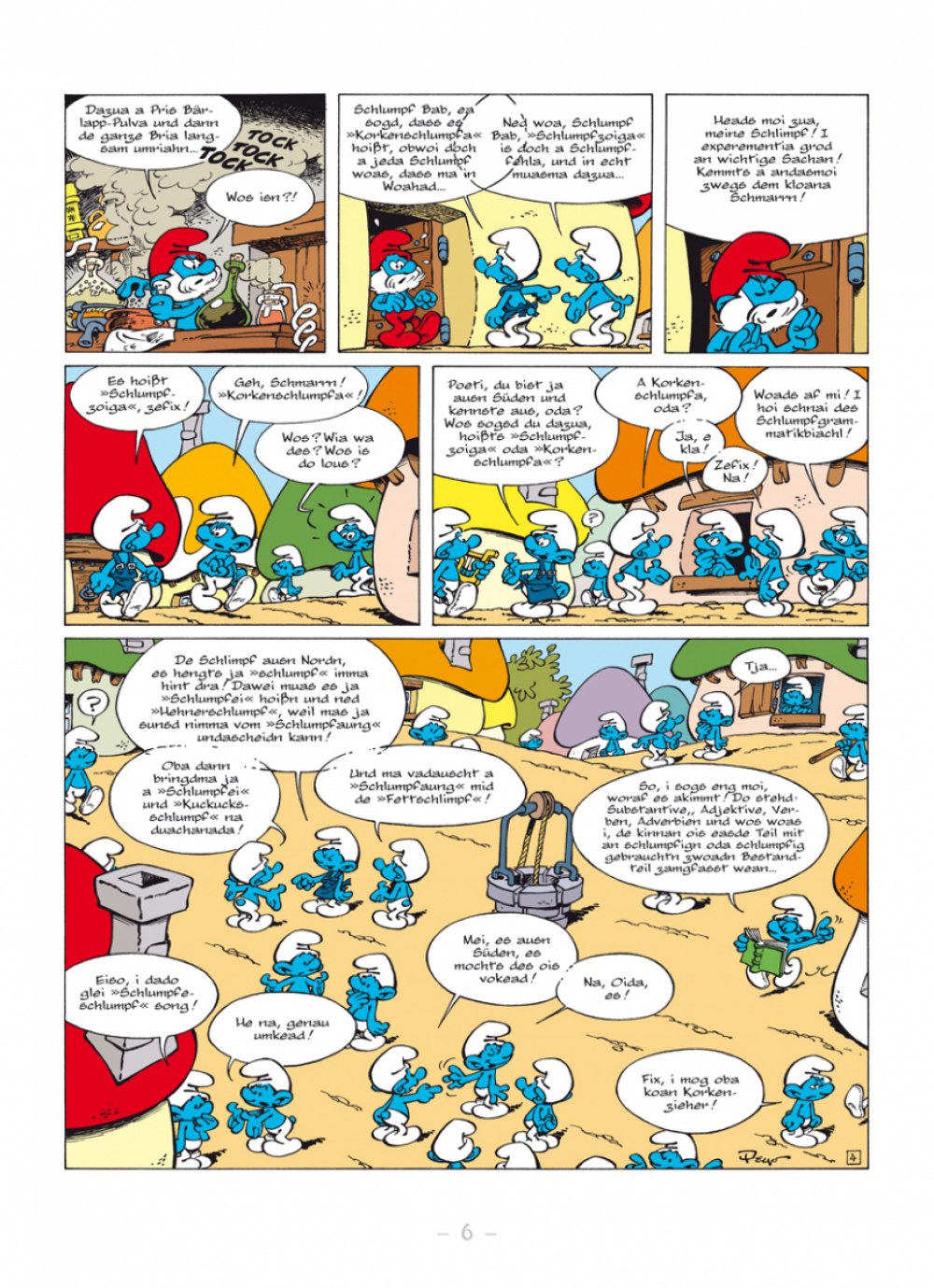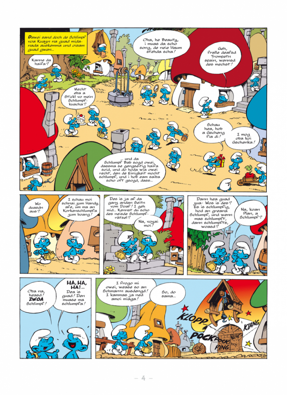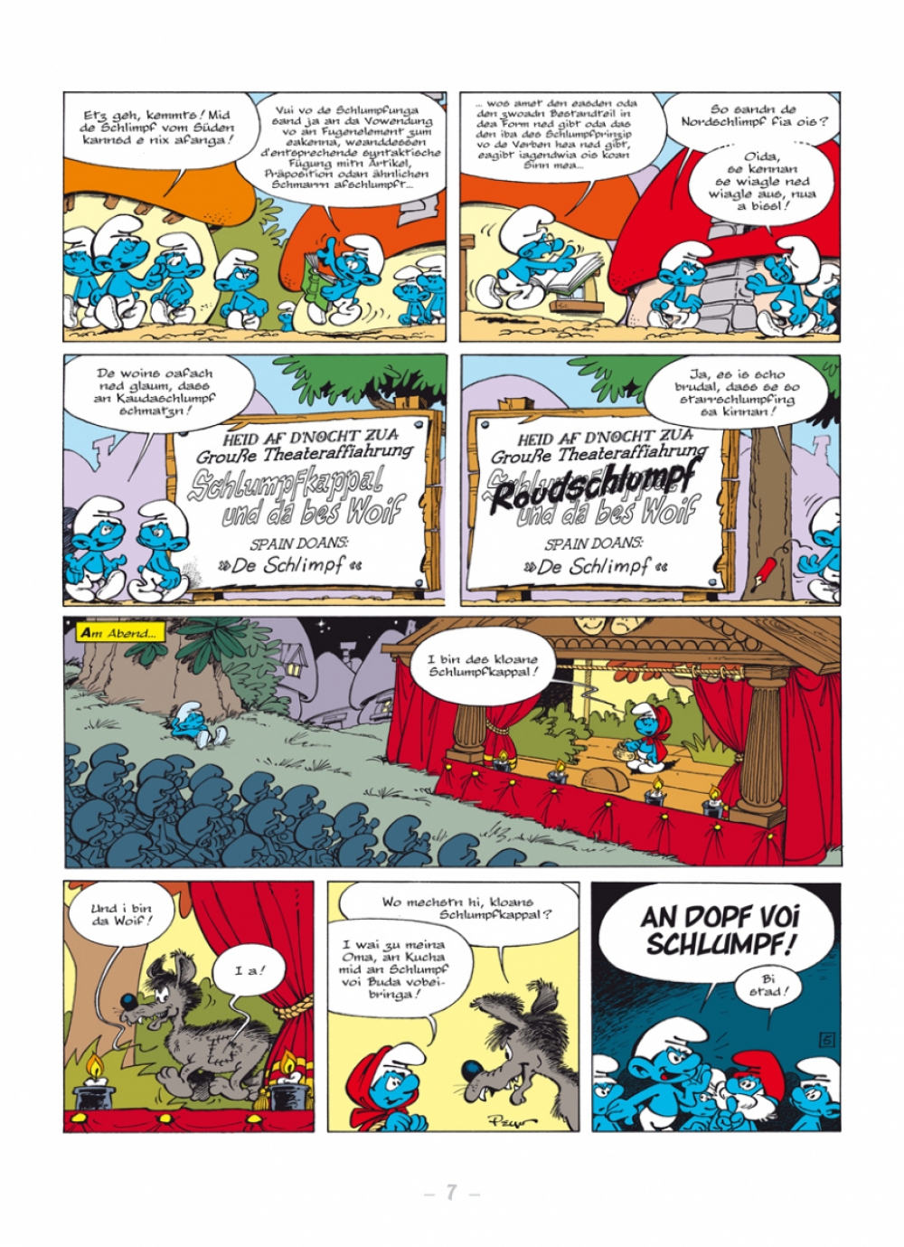 Midn im Boarischn Woid lem de Schlimpf. Normalaweis vodrongase recht guad, oba doch ren de Schlimpf ausn Norden a bissl andas ois de Schlimpf im Südn. Natürlich is do a Streitarei scha voagseng und da Bab Schlumpf woas ned weida.