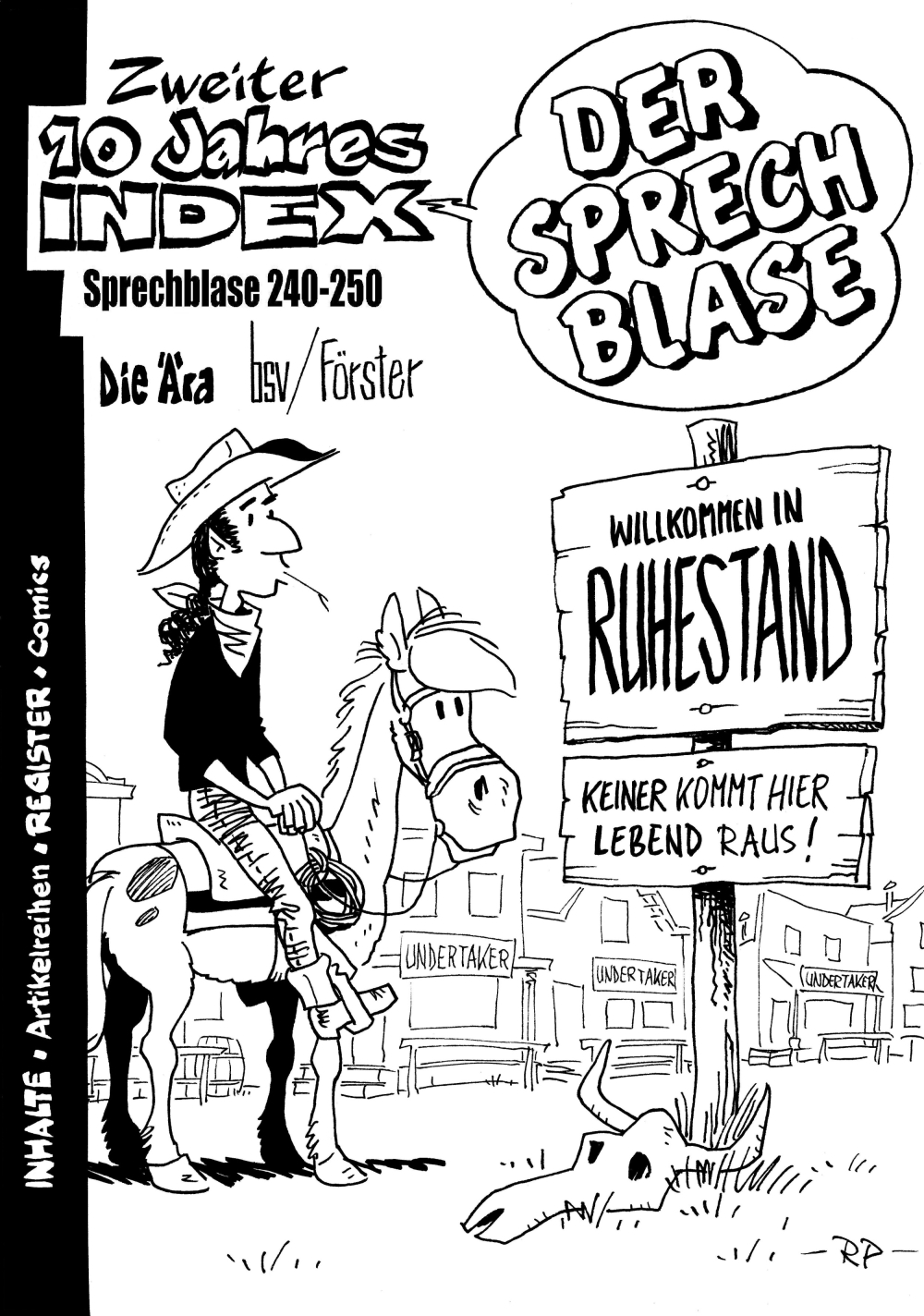 Nach Erscheinen der neuen „Sprechblase“ Nr. 250 setzt sich Gerhard Förster als „Sprechblase“-Chefredakteur zur Ruhe. Aus diesem Anlass erscheint ein weiterer Index-Band für den Rest der Förster-Ära (Sprechblase 240–250), nachdem 2019 bereits der „Sprechblase 10 Jahre-Index 2008–2018“ über die Ausgaben 211 bis 239 veröffentlicht wurde.