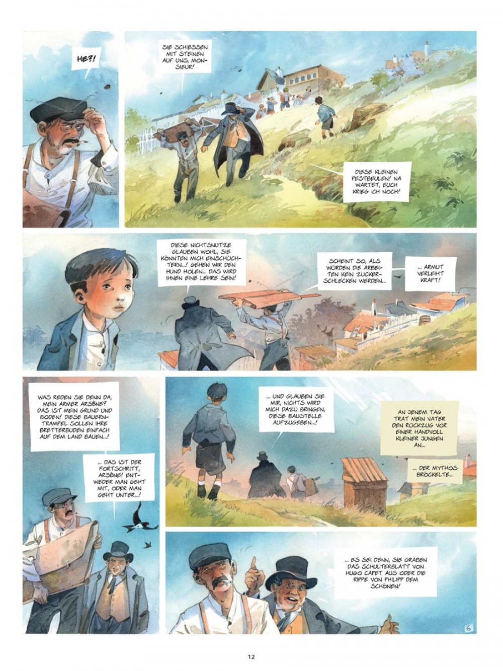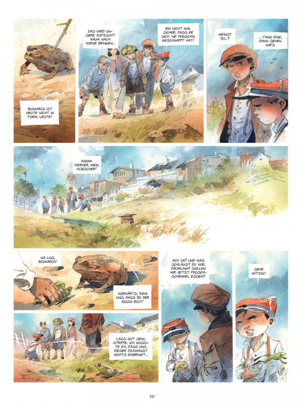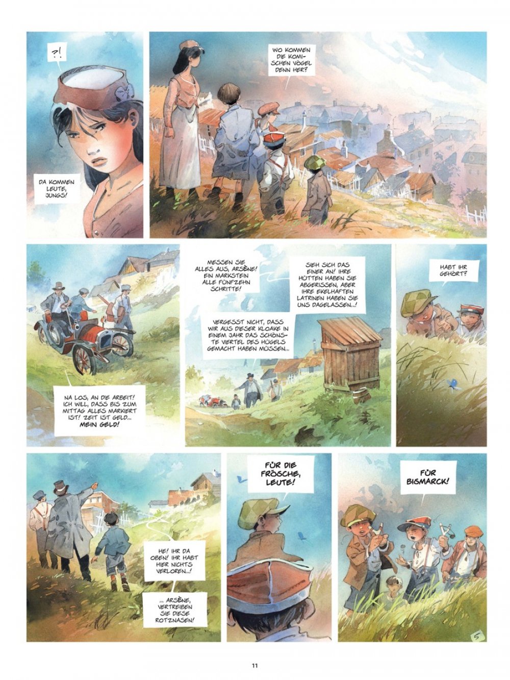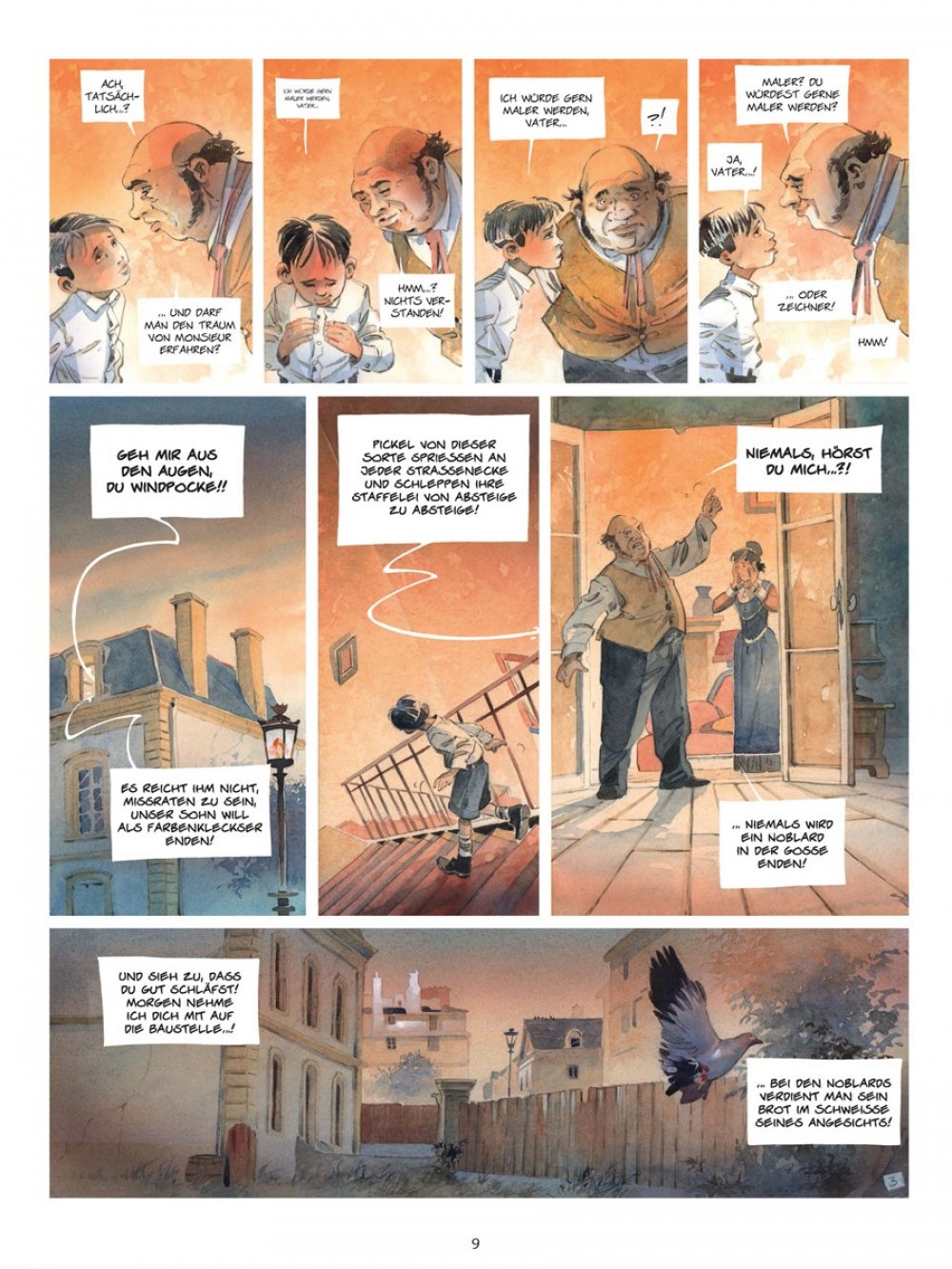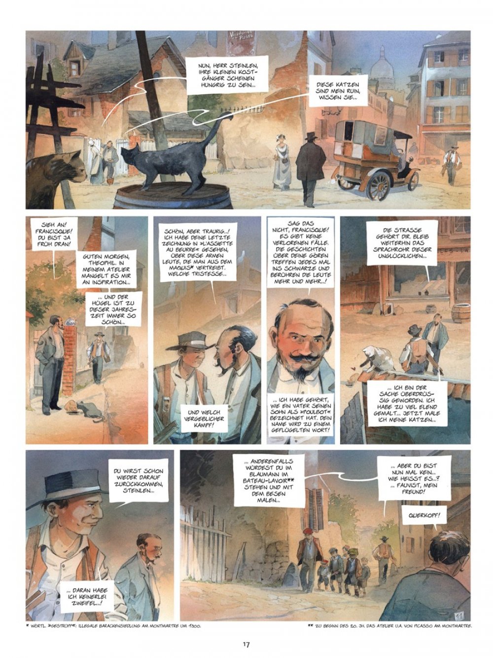 Patrick Prugne (»Pawnee«, »Die Herberge am Ende der Welt«) gelingt es, in warmen Aquarelltönen ein einzigartiges Lebensgefühl einzufangen, das zwischen bitterer Not und stolzem Selbstbehauptungswillen das Leben an sich feiert. Dass seine Bilder dabei auch Einflüsse berühmter Montmartre-Künstler jener Zeit wie Poulbot oder Steinlen aufweisen, versteht sich von selbst – schließlich treten sie im Rahmen der Erzählung ja selber auf. Mit umfangreicher Skizzensammlung im Anhang.