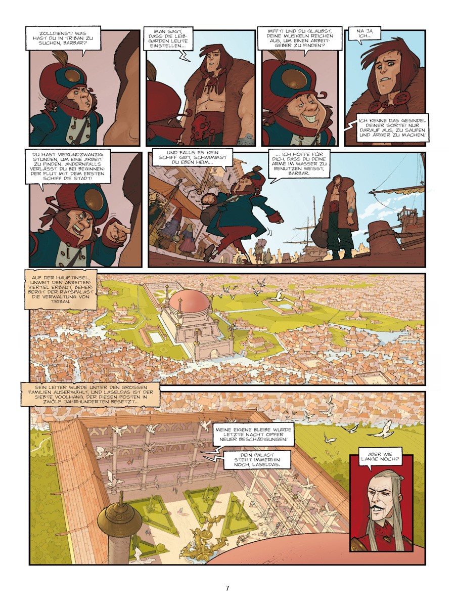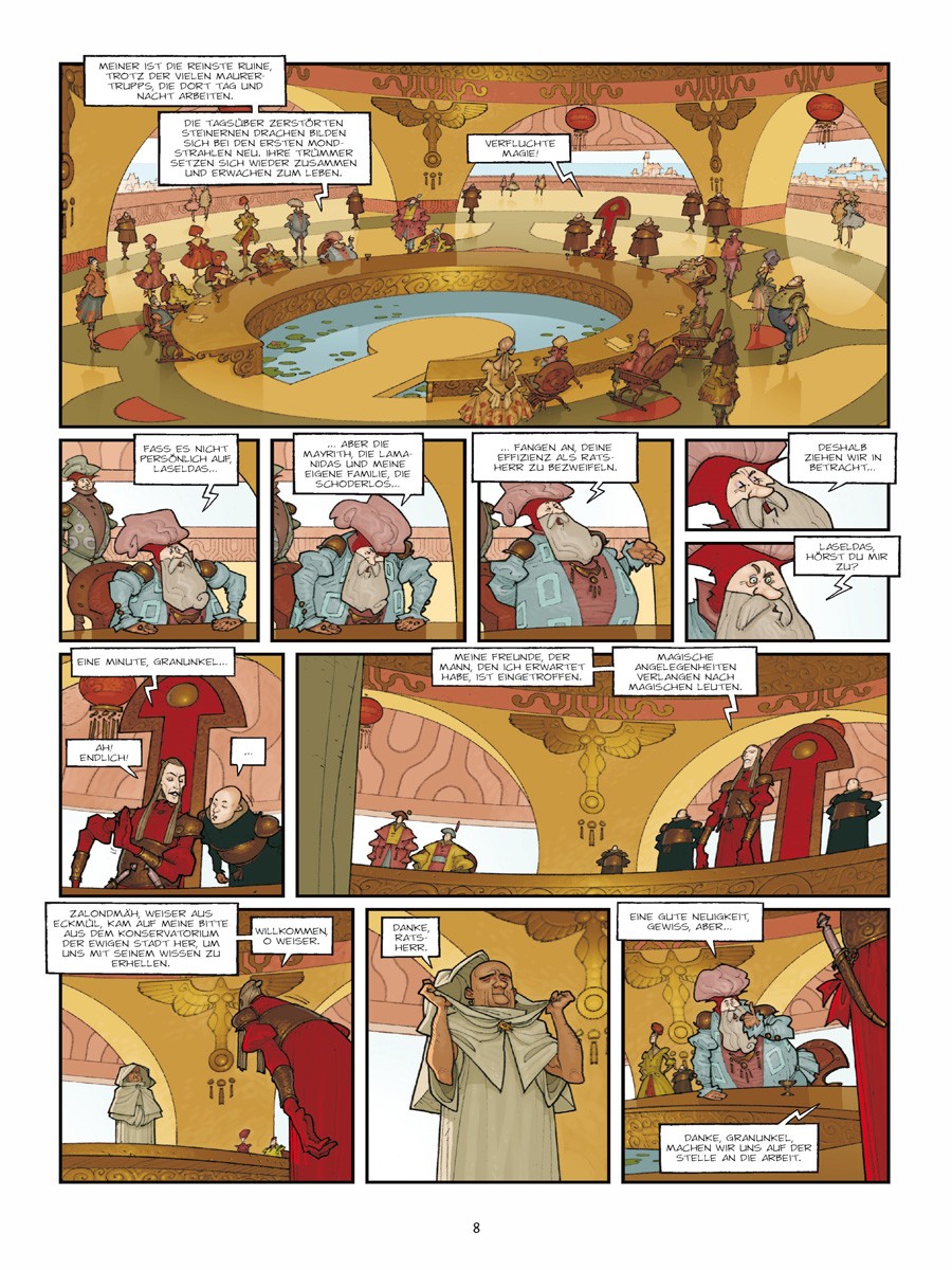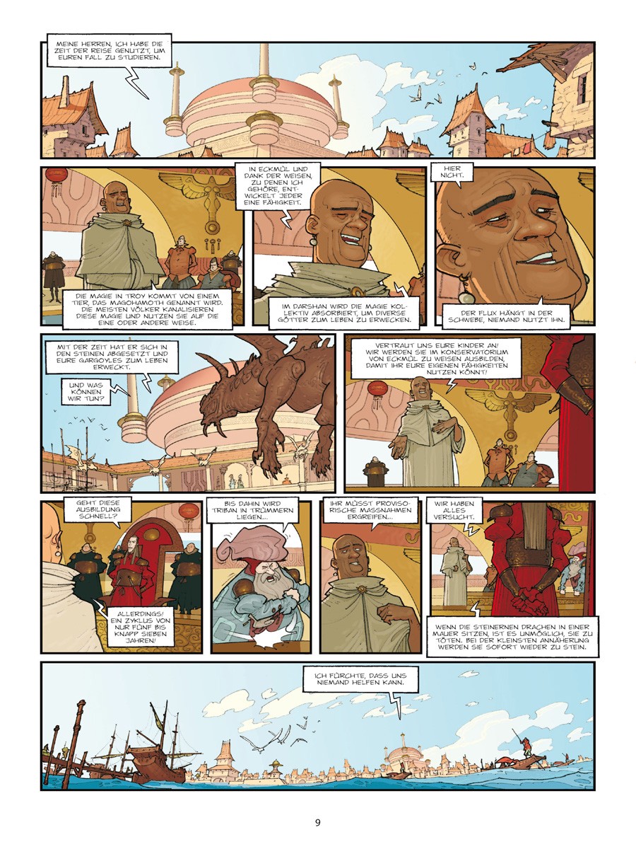 Es gab eine Zeit, als Triban noch kein von der restlichen Welt abgeschnittenes Reich war, sondern eine reiche Handelsstadt… Doch seit sie verflucht ist, kommen jede Nacht die Wasserspeier und steinernen Drachen, die die Fassaden der Häuser der einflussreichsten Familien schmücken, und fressen die Wände. Um die Zerstörung zu stoppen, sind die Weisen von Eckmühl gefragt. Oder sollte etwa Nükhu der Barbar die schlagkräftige Lösung aller Probleme sein?