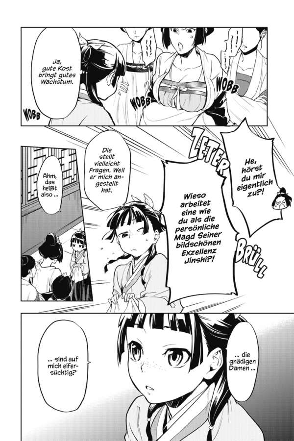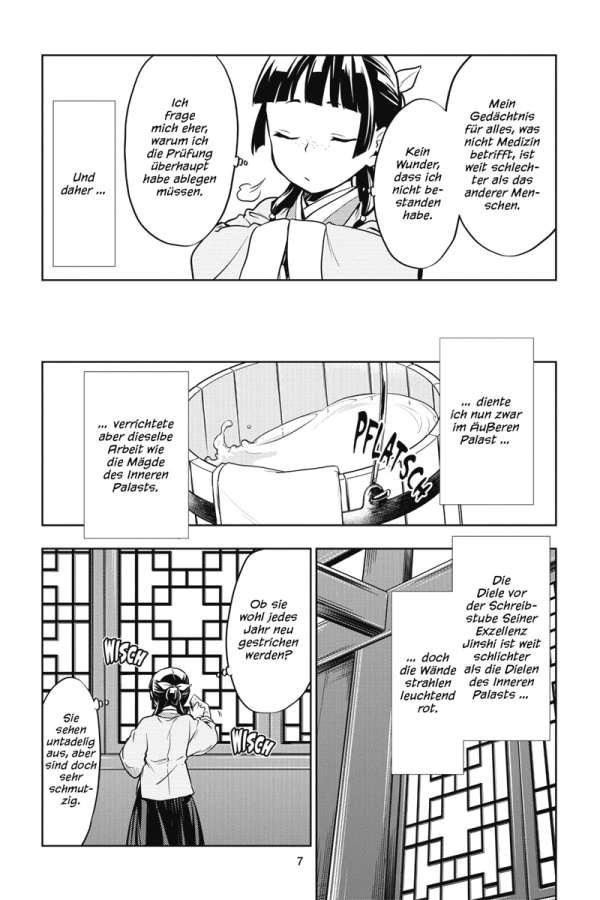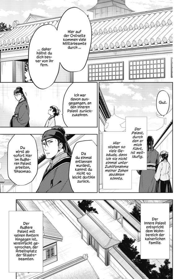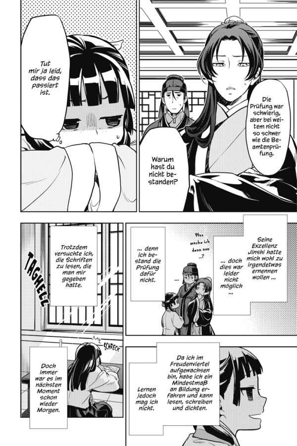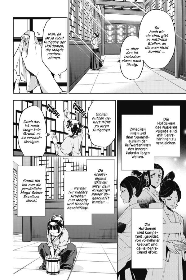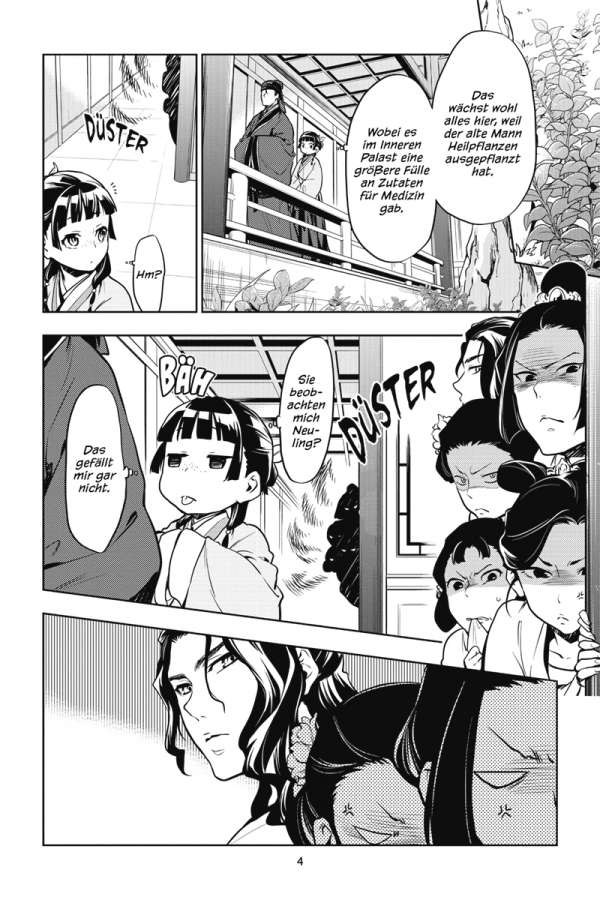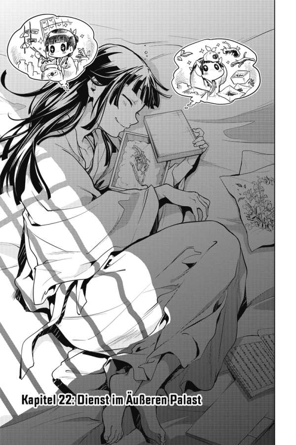 Maomao wurde aus ihrem Dienst im Inneren Palast entlassen. Nun soll sie als Angestellte dem Eunuchen Jinshi mit ihren Fähigkeiten direkt zur Seite stehen. Doch in der von Politik bestimmten Welt des Äußeren Palasts warten nicht nur zahlreiche Rätsel auf sie, die gelöst werden wollen, sondern auch so manche Hinterlist.