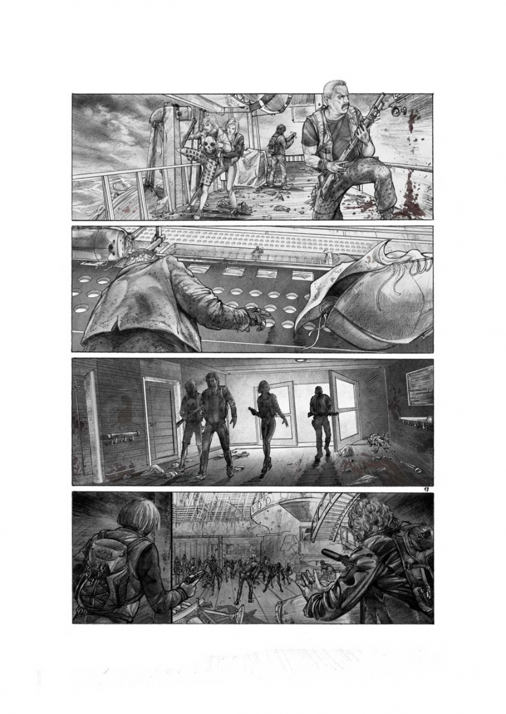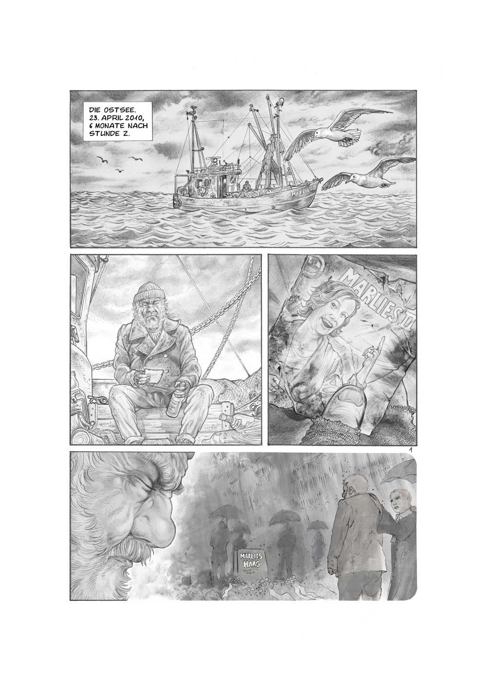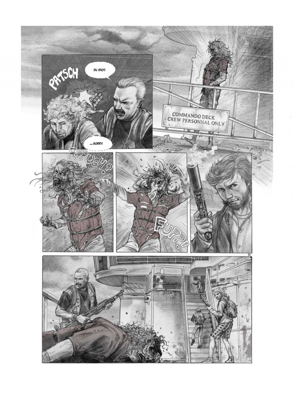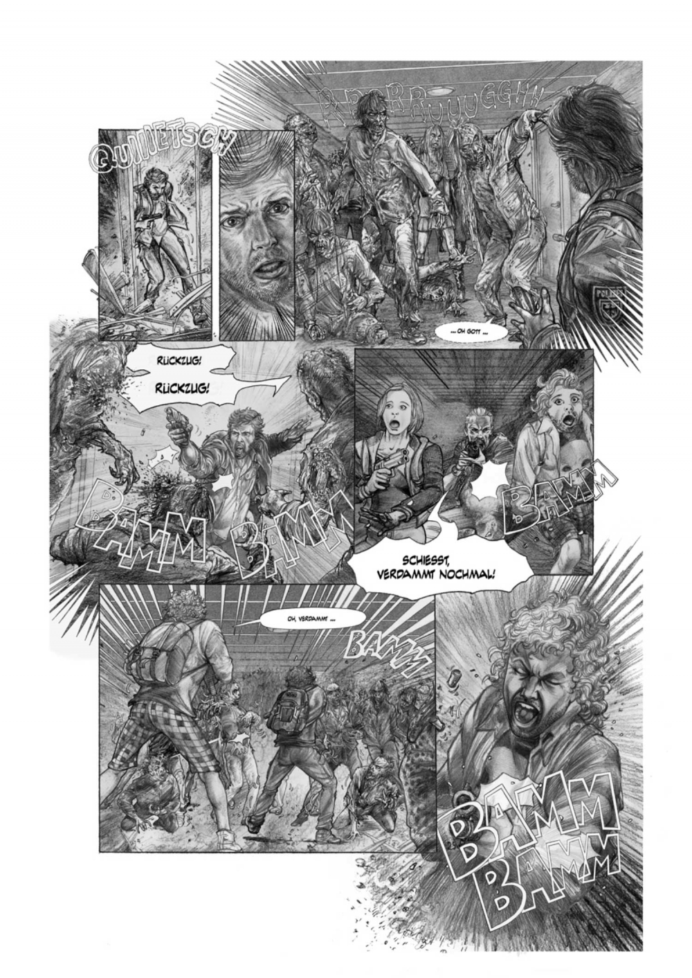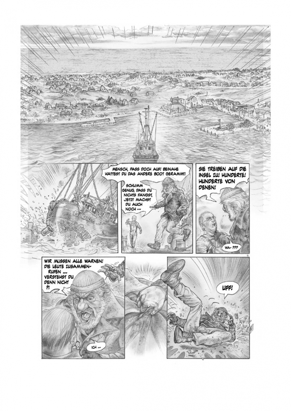 Und auch unsere einfach nicht totzukriegenden Zombies sind zurück. Diesmal geht es auf eine vermeintlich von der sechs Monate zuvor ausgebrochenen Zombieplage verschonte Ostsee-Insel. Aber eine auf die Insel zusteuernde Fähre droht das Refugium zu zerstören: Man hat ja schon von Geisterschiffen gehört, aber dieser Zombie-Dampfer setzt da neue Maßstäbe. Das erprobte Autor*innen-Gespann Völlinger und Korff-Knoblauch drehen dabei nicht nur dank Frank Freunds detailierten Zeichnungen den Gore- und Splatter-Pegel nach oben, sondern illustrieren gewohnt wasserfest die Riege der Figuren, als das, was sie letzten Endes sind: Das eigentliche Problem.