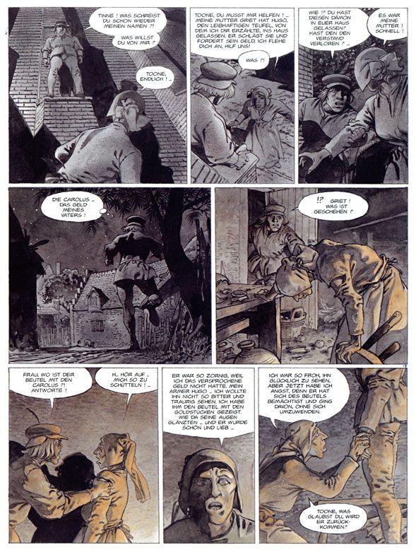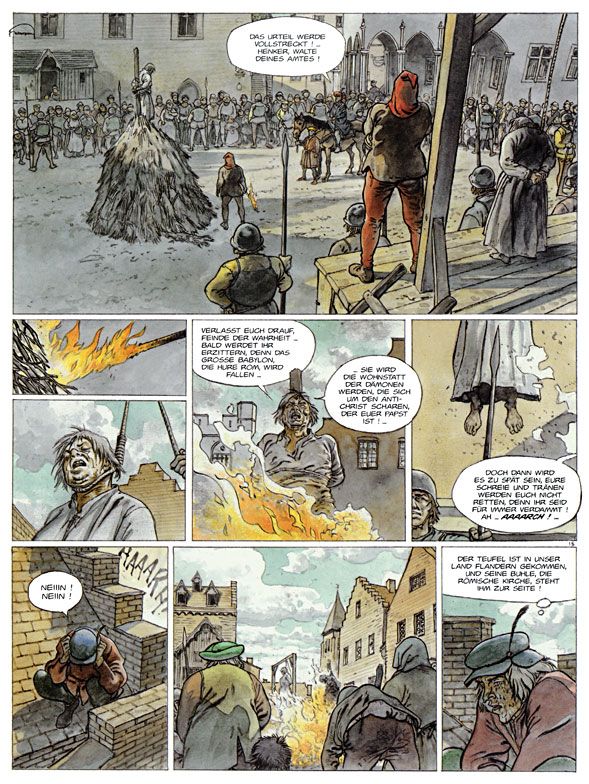 Durch welche Geschehnisse könnte dieses Gemälde entstanden sein? Darüber haben sich Hermann und Yves H. Gedanken gemacht und lassen Bos-Maury auf die tolle Grete und ihre Tochter Tinne treffen. Doch erst einmal beginnt die Geschichte bei Tinnes Freund Tonne, dessen den Lehren Luthers anhängende Familie gerade in die Hände der Folterer der katholischen Kirche fiel.