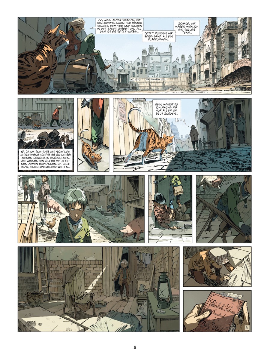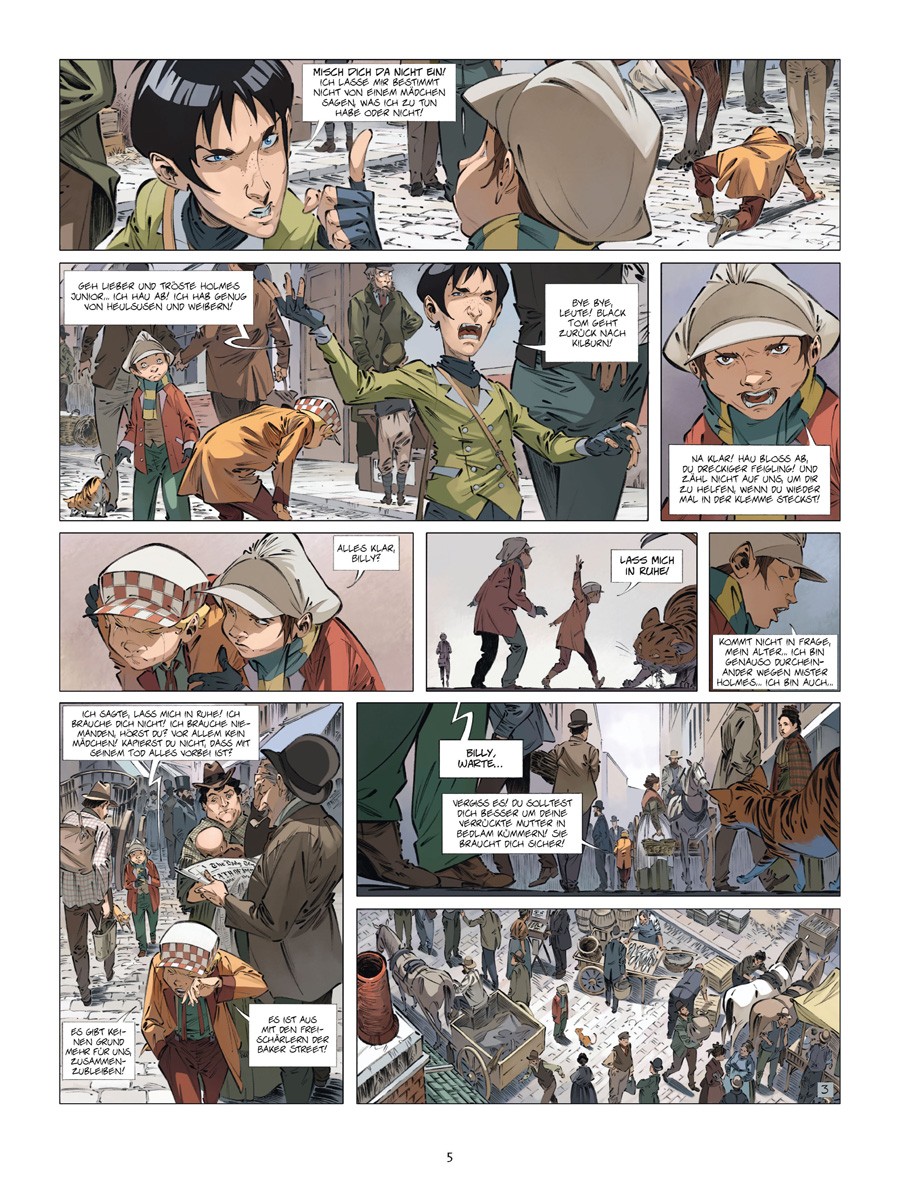 Billy, Charlie und Black Tom sind drei unzertrennliche Freunde, die sich im Londoner East End, einem echten Gaunerviertel, gemeinsam durchschlagen. Zum Glück können die drei auf den Schutz eines gewissen Sherlock Holmes zählen, der sie bisweilen als Straßenspione engagiert. Doch als Black Toms Freundin vor ihren Augen gekidnappt wird, müssen sie die von ihrem Mentor gelernten Tricks schnellstens in die Tat umsetzen. Dabei bekommen sie ganz unerwartet Hilfe von einem vierten kleinen Strolch.