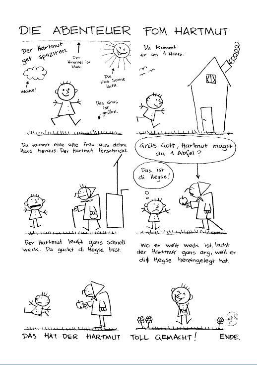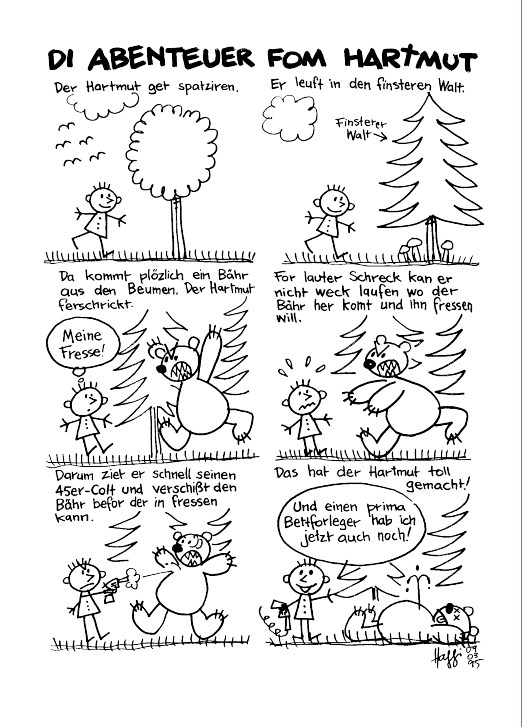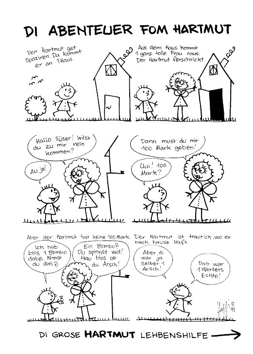 Damit auch jene, die erst später auf den kleinen Schlaumeier mit der eigenwilligen Ortographie aufmerksam wurden, seine Abenteuer ganz von Anfang an mit verfolgen können, druckt Gringo Comics die Geschichten aus den ersten Heften nun in Form von Sammelbänden nach. In diesem ersten Band können Sie nachlesen, wie der Hartmut die böse Hexe reinlegt, was er im Bahnhofskino, mit seiner Freundin Susi im Sandkasten und mit seinem besten Freund Holger beim Äpfel klauen erlebt, und natürlich auch, wie sich der Hartmut mal so richtig was getraut hat…