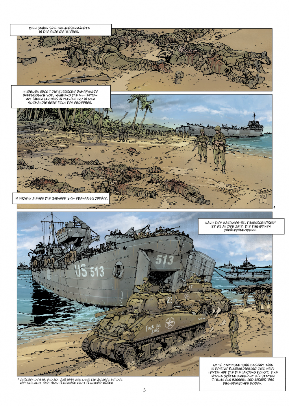 “1944 sind die Siege der Alliierten über die Streitkräfte der Achse miteinander verbunden. Im Pazifik werden die Marianen von der amerikanischen Armee übernommen und einem massiven Angriff Japans der Weg geebnet. Um die kaiserliche Armee endgültig in die Enge zu treiben, beschlossen die Amerikaner, zuerst in die Philippinen einzudringen, um die Versorgungswege abzuschneiden und die Landflugplätze zu übernehmen. Leyte liegt im Zentrum des philippinischen Archipels und ist die erste von dem Angriff betroffene Insel. Der Siegeswille der Amerikaner steht in einem angemessenen Verhältnis zu den eingesetzten Ressourcen. Die eingesetzte Armada ist die größte aller Zeiten. Aber es war ohne auf die extreme Entschlossenheit der Japaner zu zählen, die alle ihre Kräfte in einem verzweifelten Manöver vereinen werden.