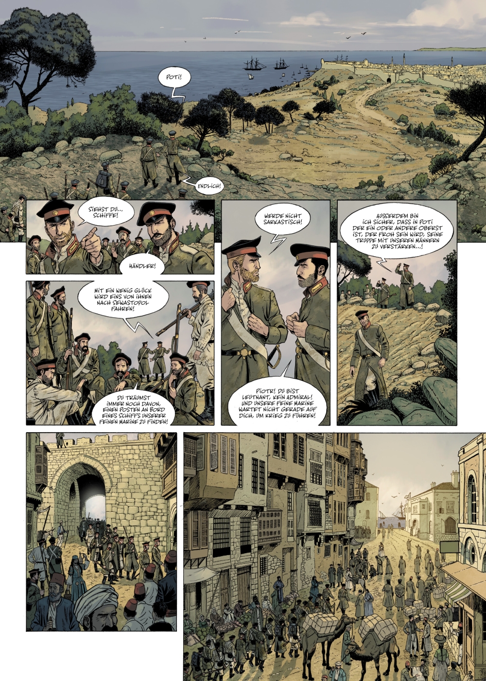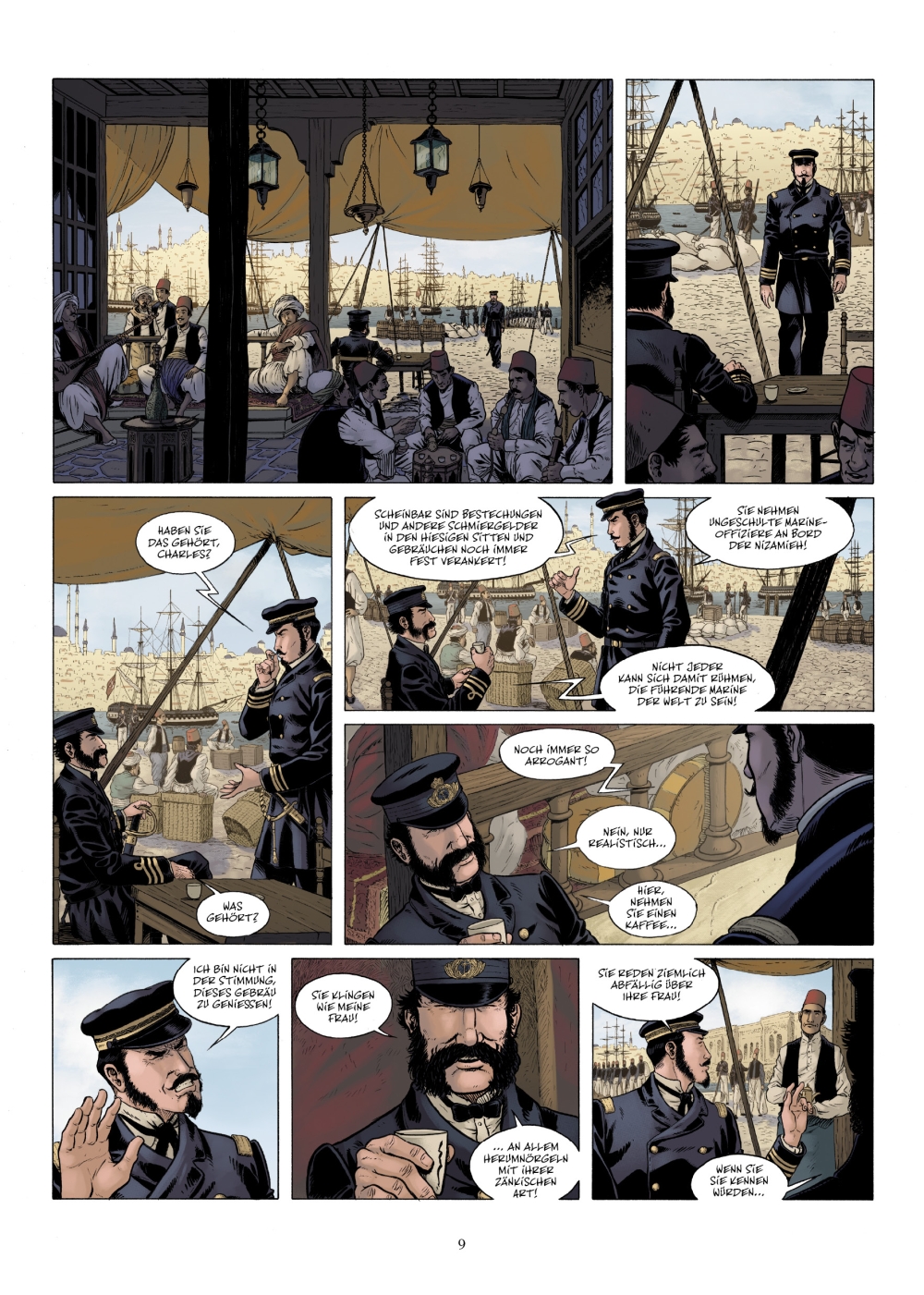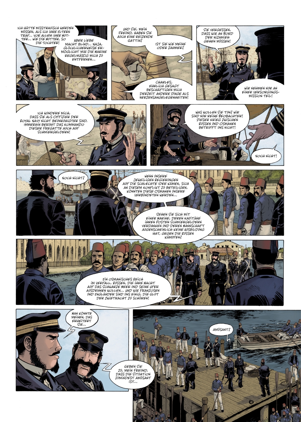 Doch im trüben Spiel der diplomatischen Beziehungen versucht jeder, den anderen zu täuschen, ohne sich bewusst zu sein, dass der manchmal eingeschlagene Weg unwiderruflich zu einem bewaffneten Konflikt führt. Zuerst streitet man sich über administrative Nichtigkeiten, bevor man Kriegsschiffe entsendet. Am 26. September 1853 erklärte Abdül Medjid I., der 31. osmanische Sultan, unter dem Druck der kriegslüsternen Parteien und aus Angst vor einem Volksaufstand Russland den Krieg. Zwei Monate später tauchen die russischen Seestreitkräfte im Schwarzen Meer vor dem Hafen von Sinope auf. Es war der 30. November 1853 und ein osmanisches Geschwader lag dort friedlich vor Anker.
