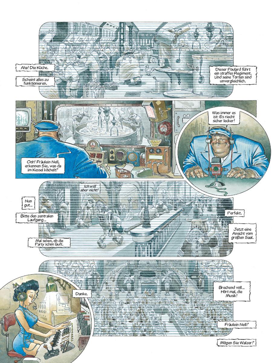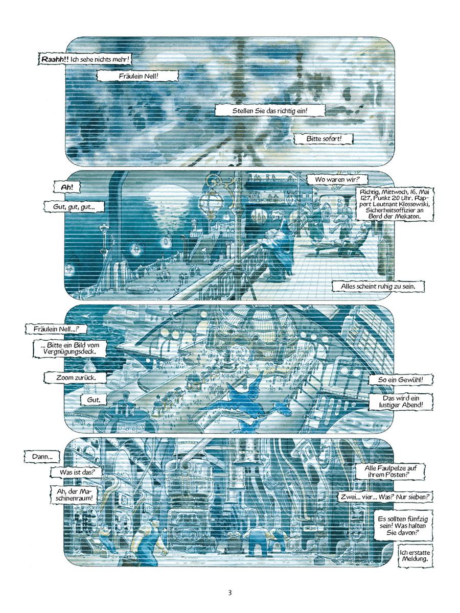 Doch das auf den ersten Blick so einladende Schiff ist in Wirklichkeit ein schwimmendes Gefängnis, denn es ist den Passagieren »zu ihrem eigenen Schutze« nicht gestattet, dieses zu verlassen. Dennoch macht sich eine Gruppe abenteuerlustiger Gestalten auf, die Außenwelt zu erkunden und landet zunächst im eisigen Antarctica und anschließend in der gigantischen Stadt Meccapolis.