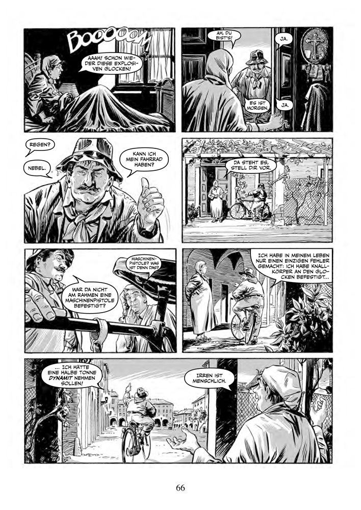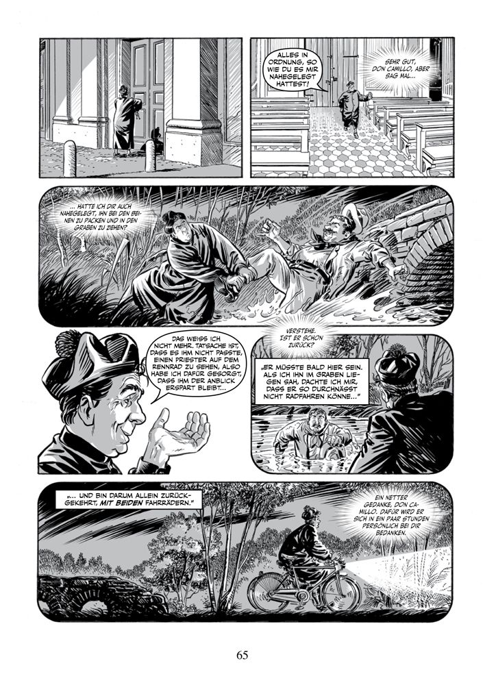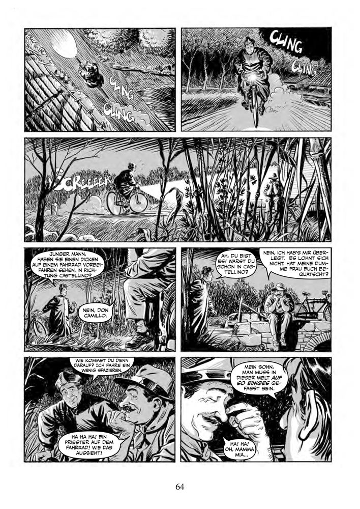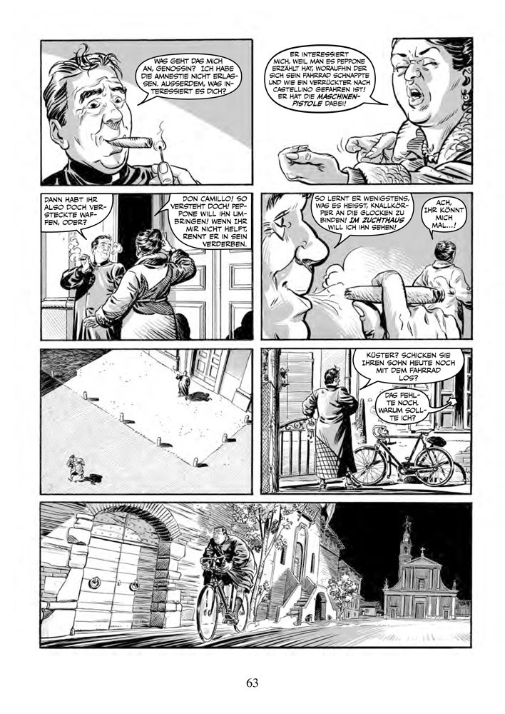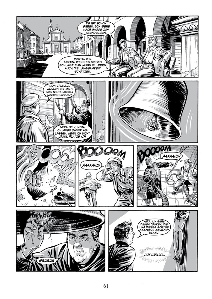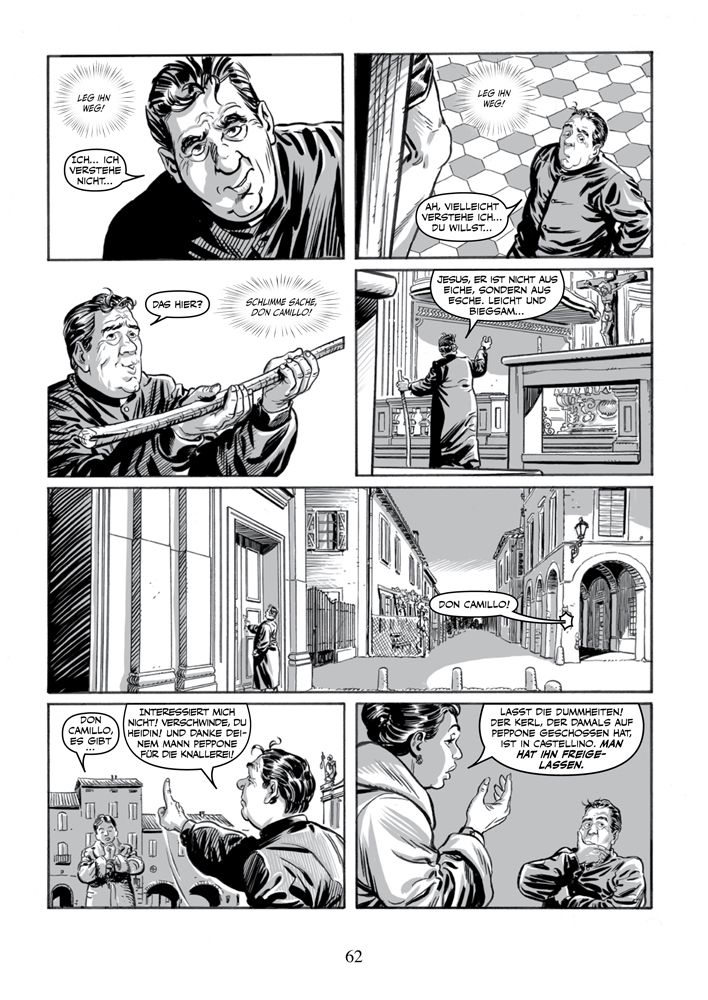 Diese Comic-Ausgabe der Erzählungen Guareschis präsentiert pro Band neun Episoden, die Don Camillo und Peppone gewidmet sind, und zwei, die auf „Mondo Piccolo“ basieren und in denen Personen auftreten, die man als Randfiguren ansehen würde, strahlten nicht auch sie diese überschäumende Lebendigkeit aus.