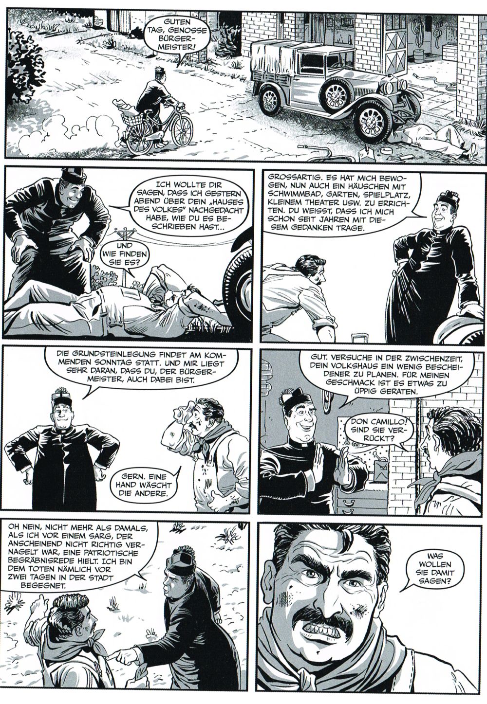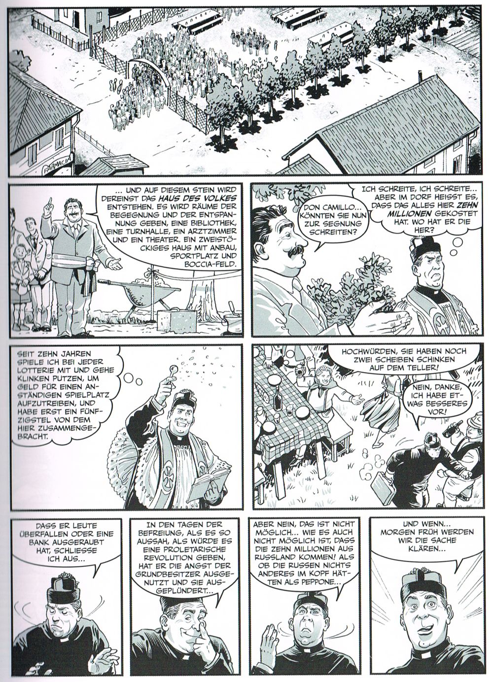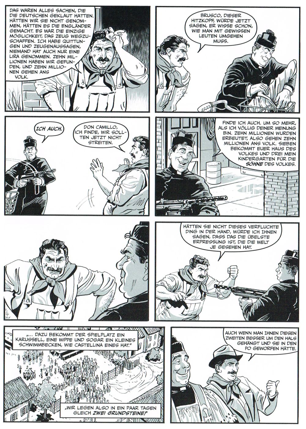 Diese Comic-Ausgabe der Erzählungen Guareschis präsentiert pro Band neun Episoden, die Don Camillo und Peppone gewidmet sind, und zwei, die auf „Mondo Piccolo“ basieren und in denen Personen auftreten, die man als Randfiguren ansehen würde, strahlten nicht auch sie diese überschäumende Lebendigkeit aus.