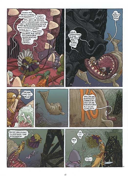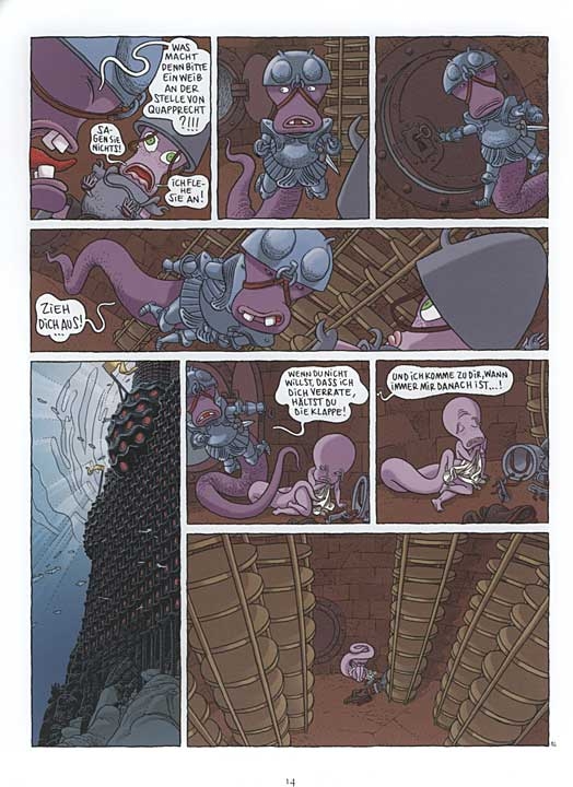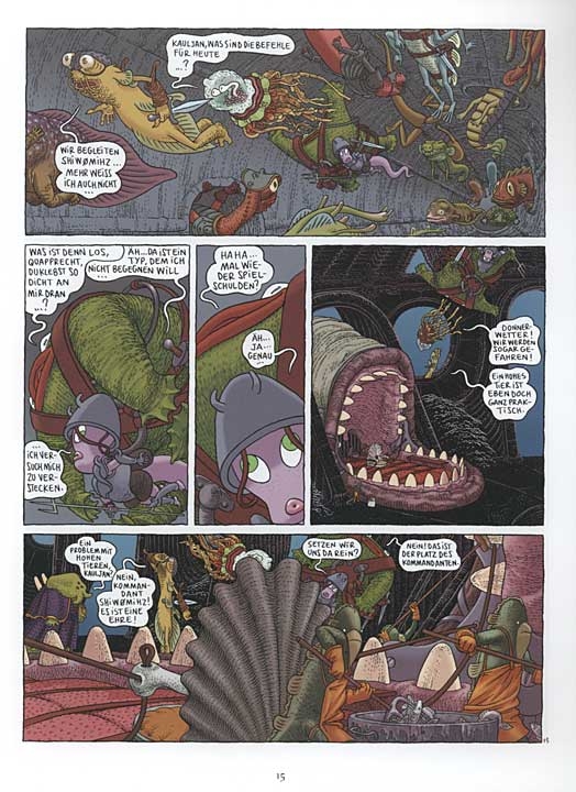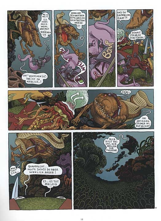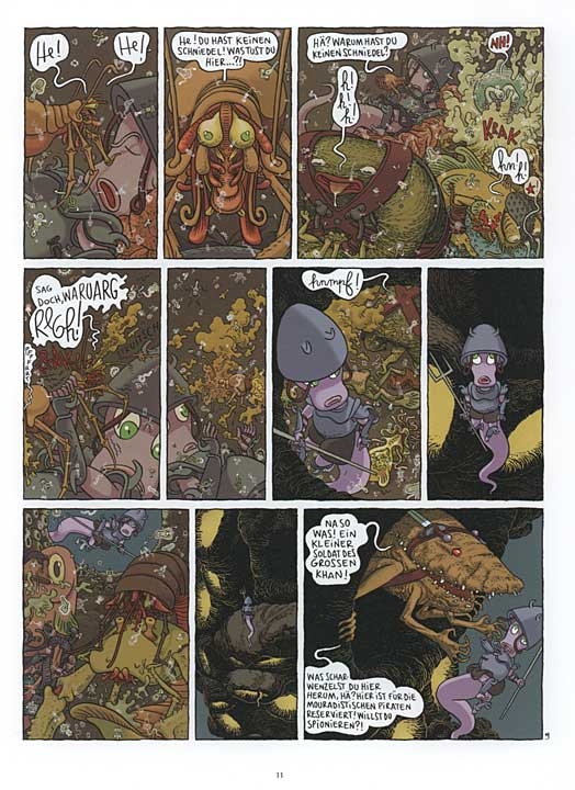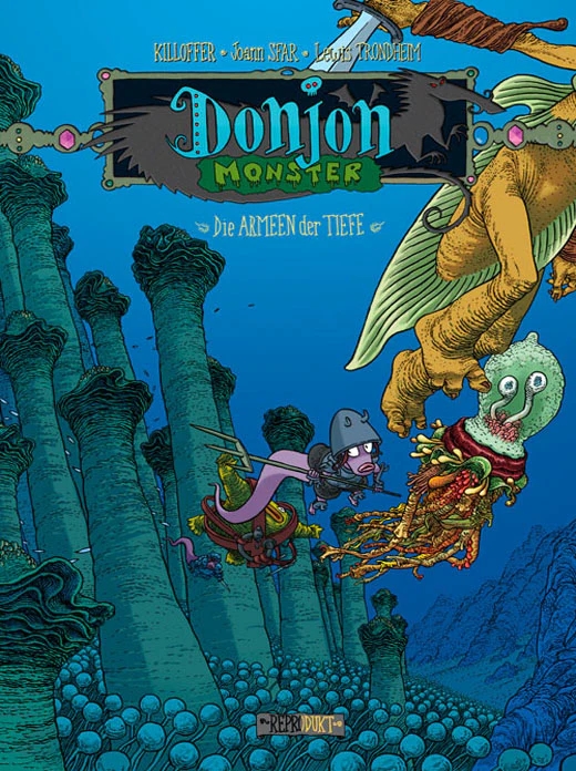 “Die Armeen der Tiefe” wurde von niemand Geringerem als L’Association-Mitbegründer Killoffer in Szene gesetzt, von dem bei Reprodukt mit “Wie man sich bettet” und “676 Erscheinungen von Killoffer” weitere Titel vorliegen. Mit geradezu überbordender Fantasie zeichnete Killoffer diese Episode der Reihe “Donjon Monster”, die auf dem Level 75 spielt – die apokalyptische Stimmung der späten Bände ab 101 ist nicht mehr allzu fern.