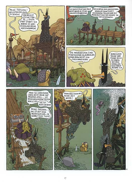 In der Tiefe des Meeres unterhalb der Schwarzen Festung hausen die unglaublichsten Kreaturen – Fische, Quallen, Kraken und andere bizarre Geschöpfe. Die reizende Flossine, eine kaulquappenförmige Aquavitin und verwöhnte Tochter eines Hohepriesters der Bathysten-Sekte, muss miterleben, wie ihre Eltern von den Söldnern des Großen Khans niedergemetzelt werden. Um ihre Haut zu retten, nimmt sie die Identität eines Soldaten der Armee der Söldner an. Deren Oberbefehlshaber, Prinz Papsukal, Sohn des Großen Khans, gelingt es, ein Bündnis mit dem gefürchteten Piratenheer der Mouradisten zu schließen. Die vereinigte Streitmacht rüstet sich unter der Leitung des ruchlosen Shiwomihz zur entscheidenden Schlacht gegen die Bathysten…