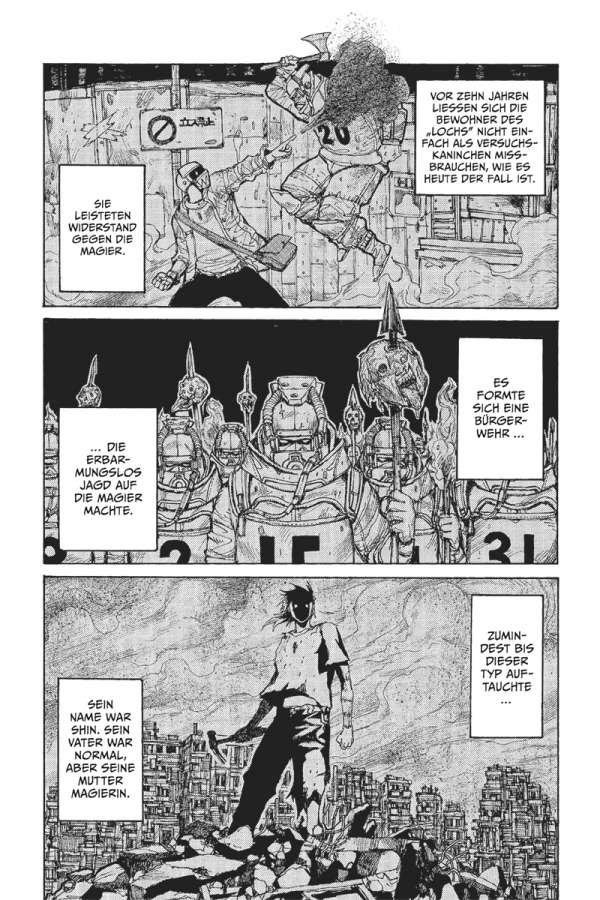 In einer Stadt, so düster, dass sie nur als „Loch“ bekannt ist, leben die Menschen in immerwährender Furcht vor den brutalen Magiern, die grausame Experimente an ihnen durchführen. Auch Caiman wurde Opfer eines solchen Experiments und hat dabei all seine Erinnerungen verloren. Zusammen mit der Restaurantbesitzerin Nikaido ist er auf der Suche nach Risu, einem Mann, der in Verbindung mit Caimans Vergangenheit zu stehen scheint … Enthält Band 4 und 5 der japanischen Originalausgabe.