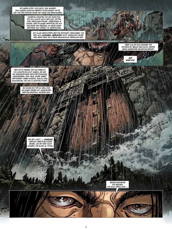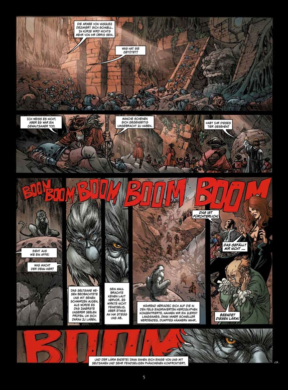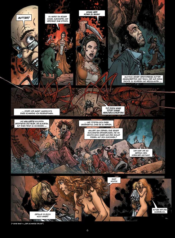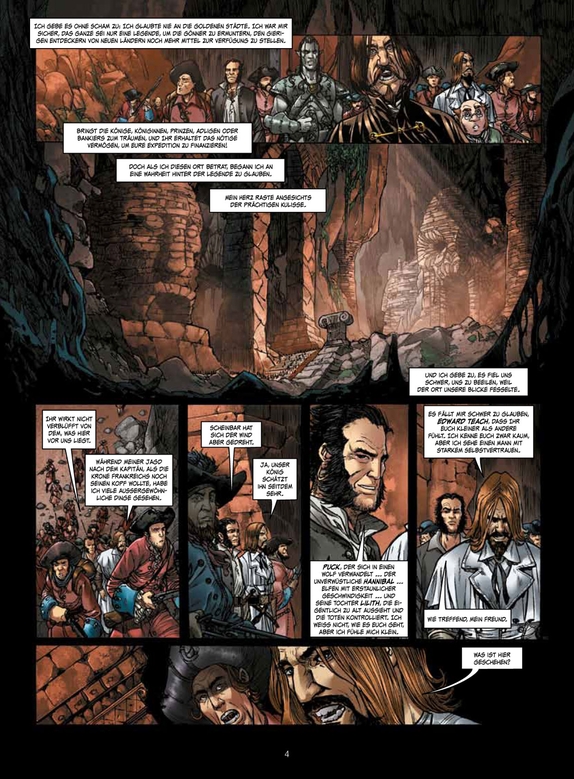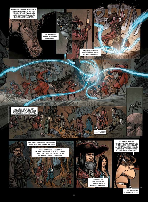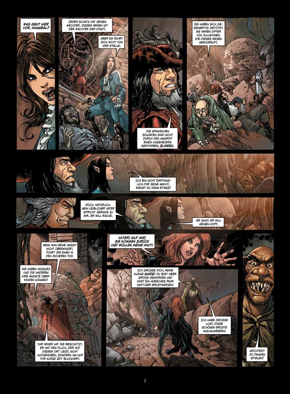 Ich bin die Tochter von Hannibal Mériadec und seine einzige Erbin! Ich habe mich unlängst entschieden, ihm mit Leib und Seele zu folgen, und wenn ich einen Eid leiste, dann halte ich mein Wort, ob es euch gefällt oder nicht! Einige von euch scheinen zu glauben, der mögliche Tod des Kapitäns würde sie davon befreien, dieses Abenteuer bis zum Ende fortzusetzen. Während wir auf seine Rückkehr warten, übernehme ich daher das Kommando und erwarte, dass mir ohne Widerrede gehorcht wird! Wenn jemand etwas zu sagen hat, was meiner Entscheidung widerspricht, sollte er es sofort tun … … oder sein verdammtes Maul halten!