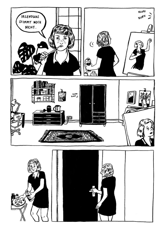 Issues, sagt Tine Fetz und führt uns in ihrer Geschichte in die Ateliers einer Kunstakademie, in der eine junge Studentin spät abends allein vor ihrem Porträt sitzt.