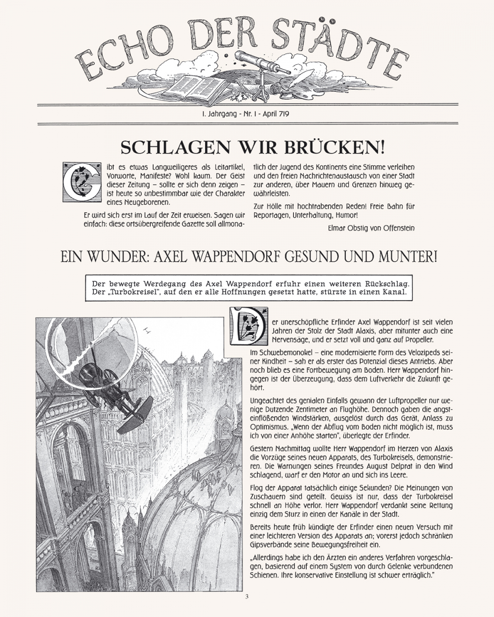 Im "Echo der Städte" findet man Informationen aller Art, kurzweilig vermittelt. Vor allem die Berichte über spektakuläre Affären wie das Geheimnis der Kugeln, die Verschollenen von Blossfeldstad oder der Skandal um den Allumfassenden Tausch werden den geneigten Leser fesseln.