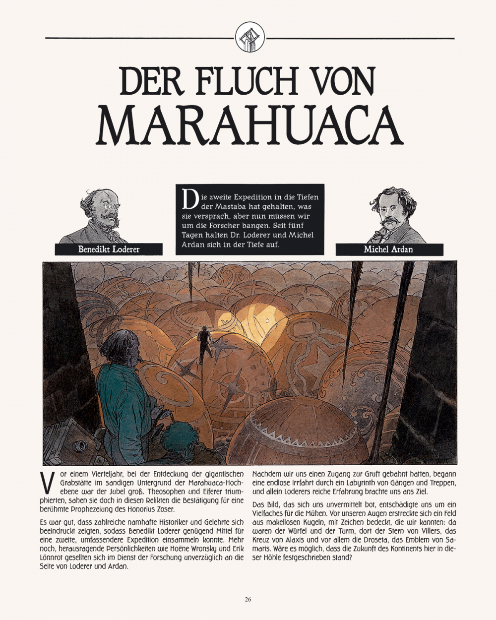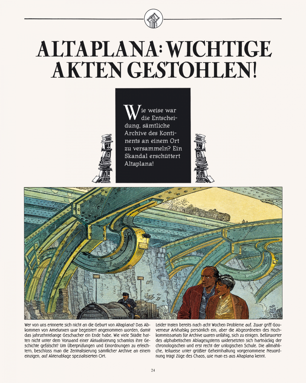 Aus ihrem Zyklus Die Geheimnisvollen Städte legen hier Autor und Zeichner einen neuen Band vor. In altbewährter Manier von Text und imposanter Grafik ist er diesmal im Stile einer Zeitschrift konzipiert, in der einzelne Artikel zu einem Ganzen aufgebaut sind.