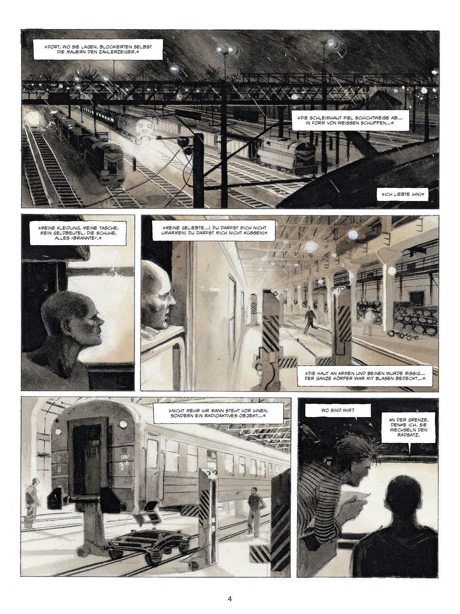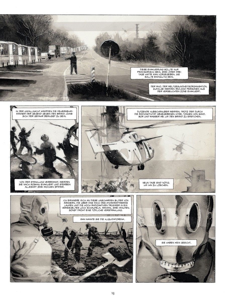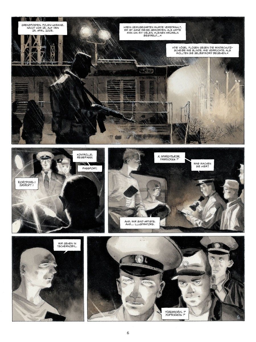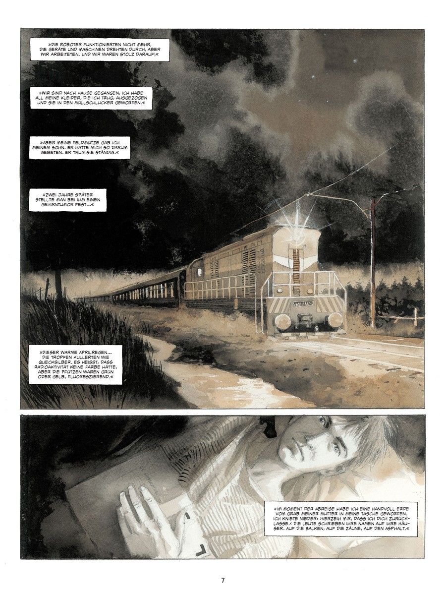In Tschernobyl beginnt der Reaktorkern des Atomkraftwerks zu schmelzen. Eine radioaktive Wolke zieht über mehrere tausend Kilometer hinweg, ohne dass irgendjemand davon weiß – und sich davor schützt. Es ist die größte Nuklearkatastrophe des 20. Jahrhunderts, die zehntausende Opfer fordern wird. Emmanuel Lepage ist zu dieser Zeit 19 Jahre alt. Ungläubig sieht und hört er die Nachrichten im Fernsehen. 22 Jahre später, im April 2008, fährt er nach Tschernobyl, um mit seinen Texten und Zeichnungen vom Dasein der Überlebenden und ihrer Kinder in dem hochverseuchten Gebiet zu erzählen. Als er beschließt, auf Anfrage des Vereins Dessin’acteurs dort hinzufahren, hat Lepage das Gefühl, dem Tod entgegenzutreten. Als er im Zug sitzt, der ihn in die Ukraine bringt, geht ihm eine Frage nicht mehr aus dem Sinn: Warum bin ich hergekommen?
