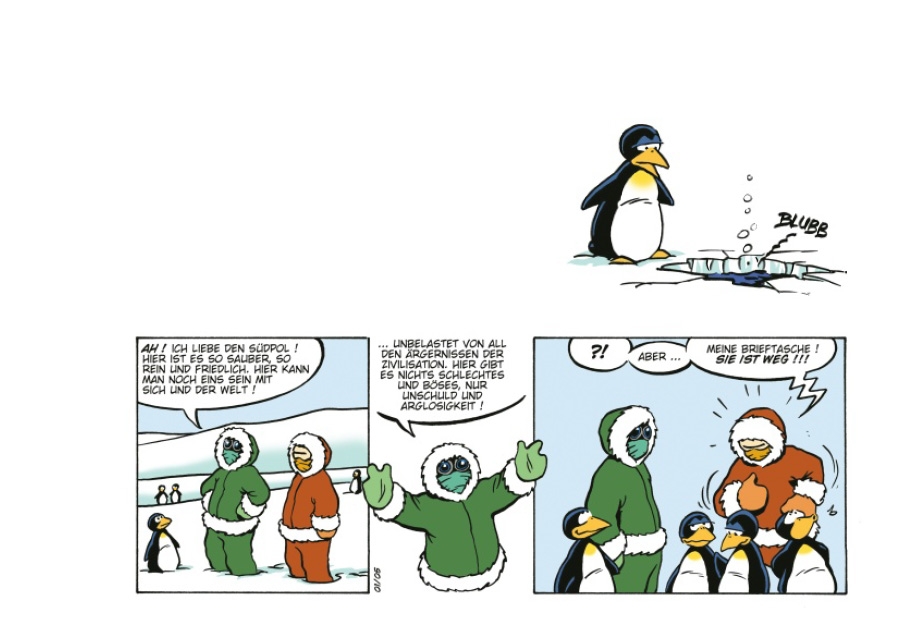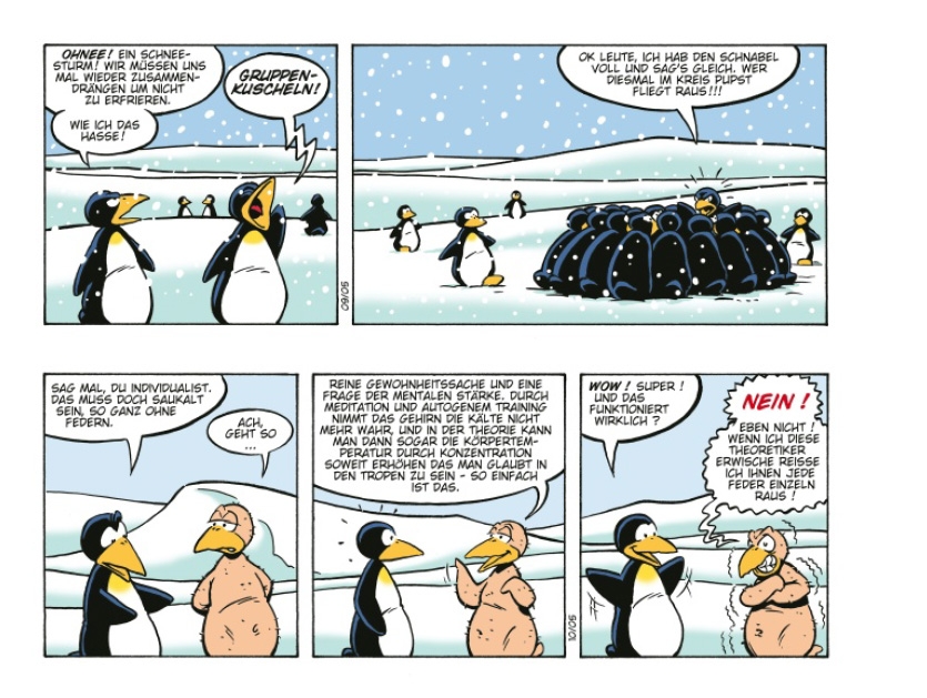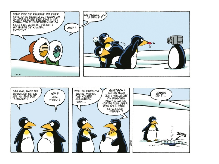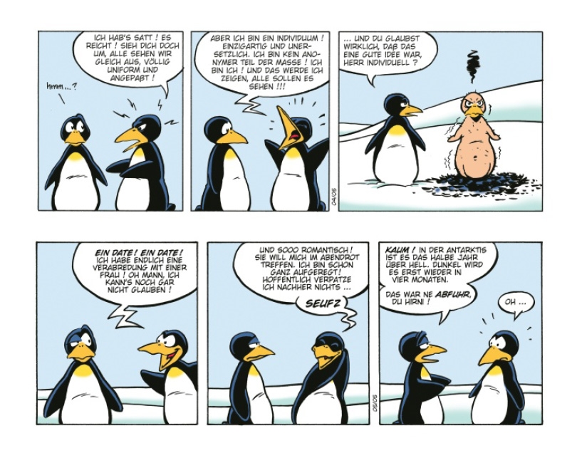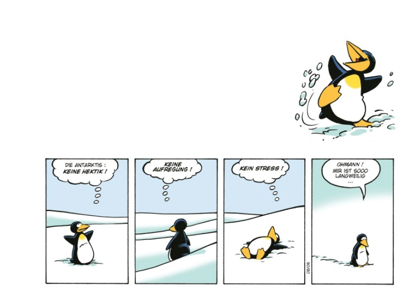 Mit "Eiszeit" ist Geier ein großartiger Comicstrip gelungen, der unter dem Titel "Sphenisci" in der Schweiz erfolgreich ist. Nun kann man die schrägen Laufvögel auch gesammelt als Buch bekommen. Viel Spaß - und vorallem warm anziehen dabei!