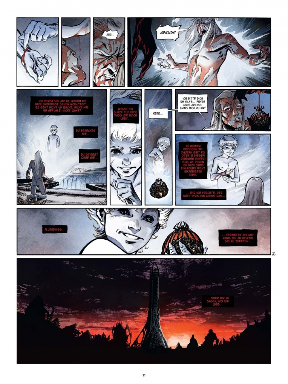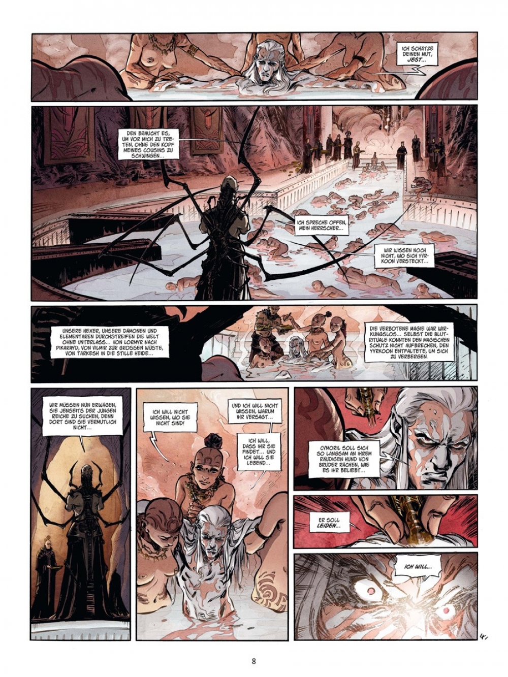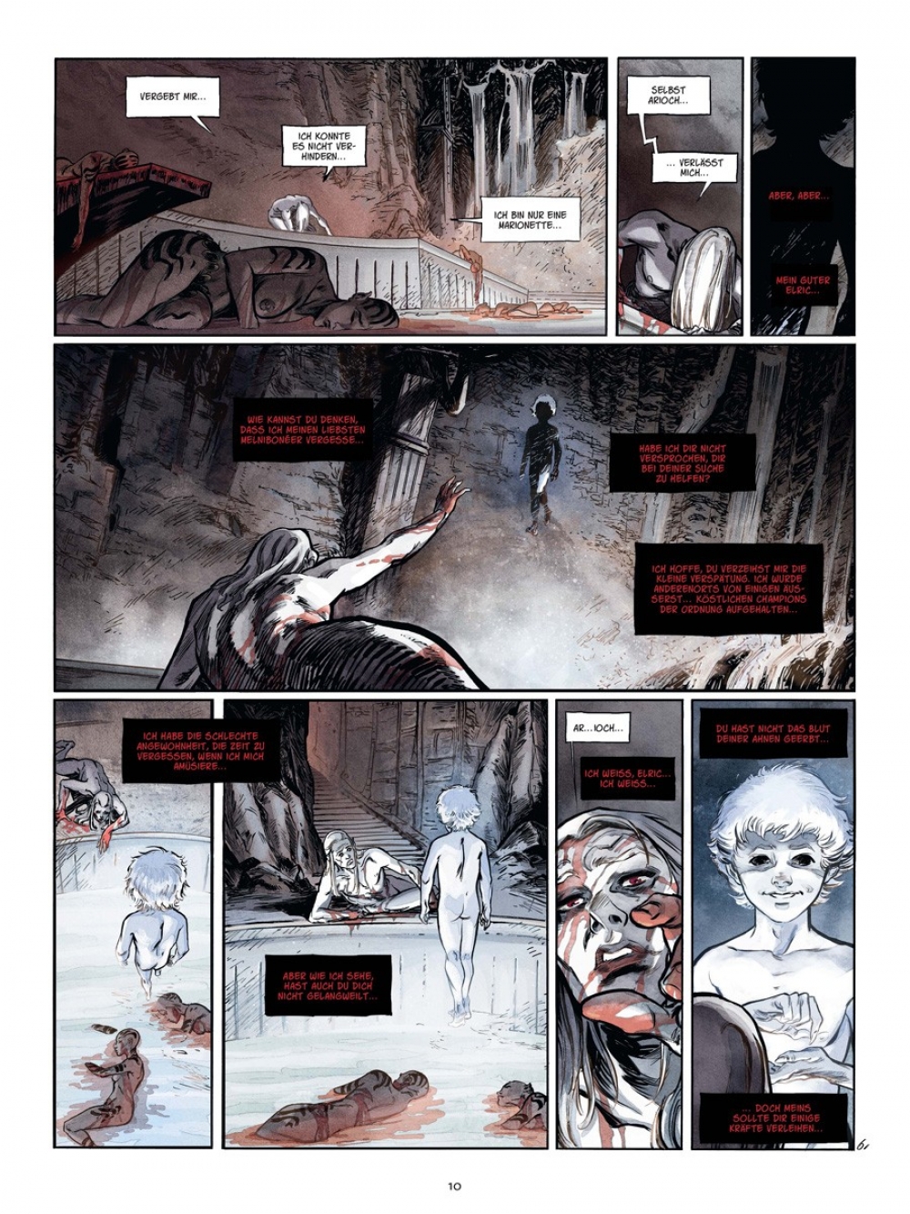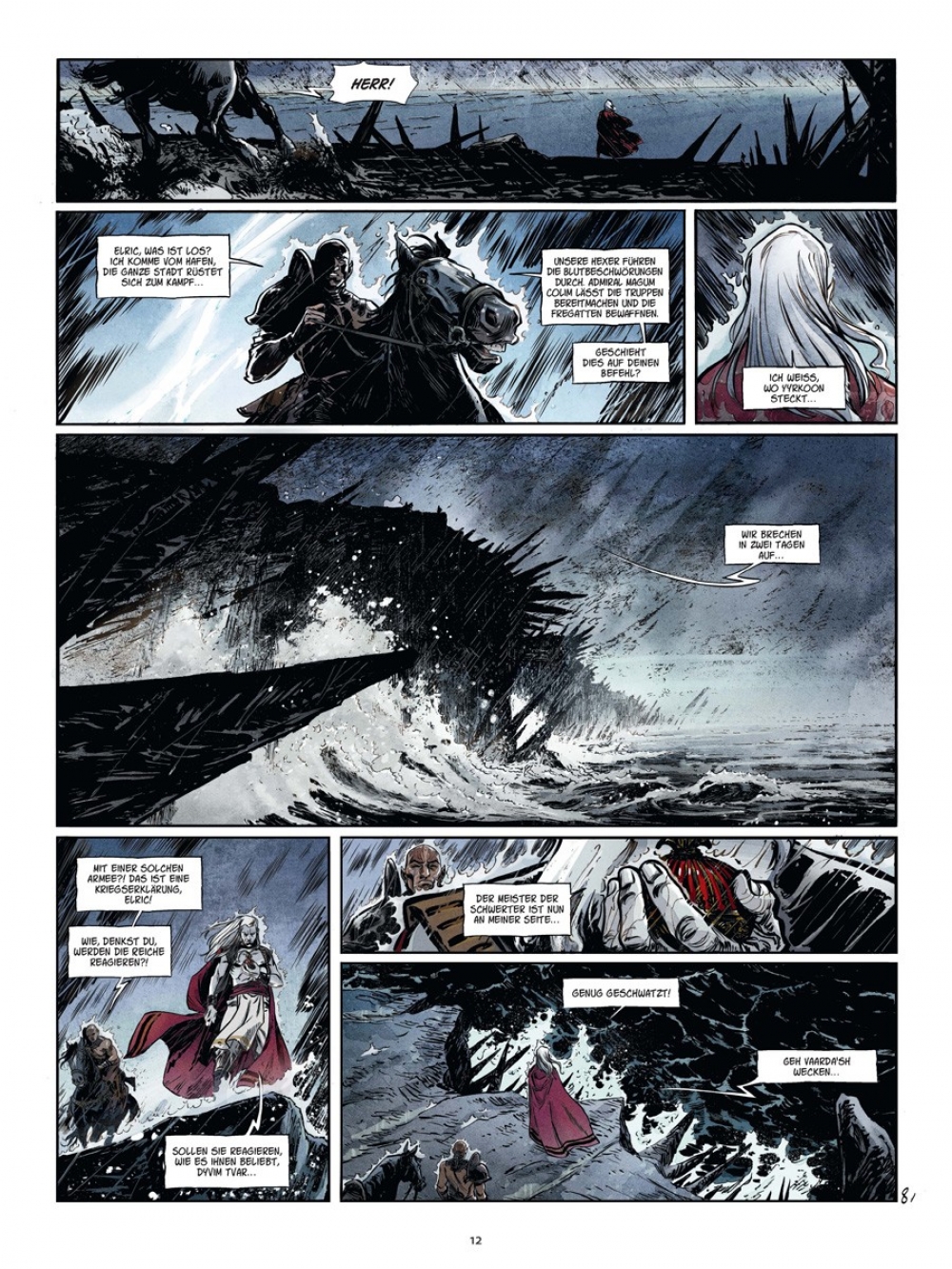 Entdeckt die Comic-Adaption der berühmten Saga von Elric von Melniboné! Entsprungen 1961 aus der Feder des Briten Michael Moorcock, ist dieser dekadente Antiheld geprägt von einer tragischen Romantik , was in der Heroic-Fantasy eher selten zu finden ist. Elric ist heute eine feste Größe des Genres, neben Howards »Conan« und Tolkiens »Der Herr der Ringe«. Die Saga von Elric wurde in den letzten fünfzig Jahren immer wieder von anderen Künstlern adaptiert, in Prosa, Comic (zum ersten Mal 1969 durch Philippe Druillet!), Videospielen, Rollenspielen... Episch, gothic, maßlos, betörend, erhielt diese neue 100% französische Adaption, mit verschwenderischer Bildgewalt von Didier Poli und Robin Recht in Szene gesetzt, die begeisterte Zustimmung von Michael Moorcock persönlich!