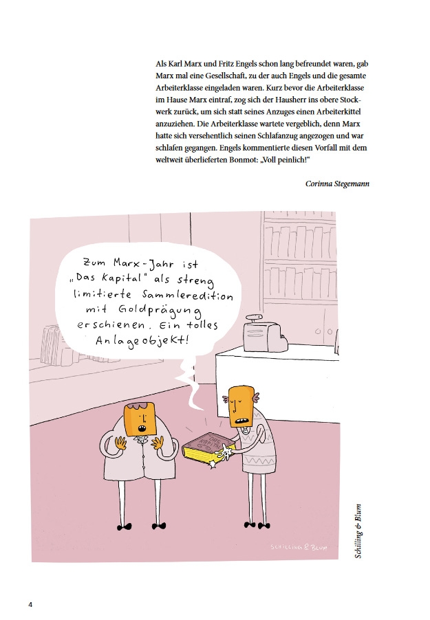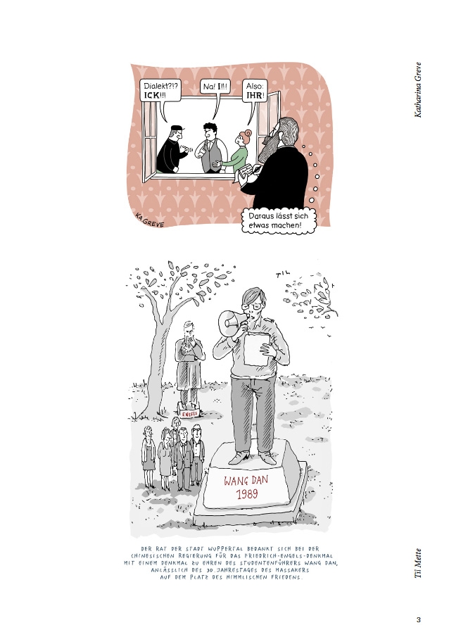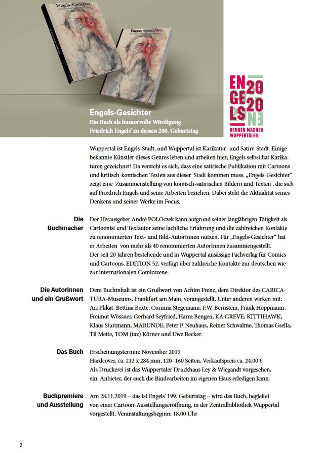 Einige bekannte Künstler dieses Genres leben und arbeiten hier; Friedrich Engels selbst hat Karikaturen gezeichnet! Da versteht es sich, dass zu seinem 200. Geburtstag eine satirische Buch-Publikation mit Cartoons und kritisch-komischen Texten aus unserer Stadt kommen muss.