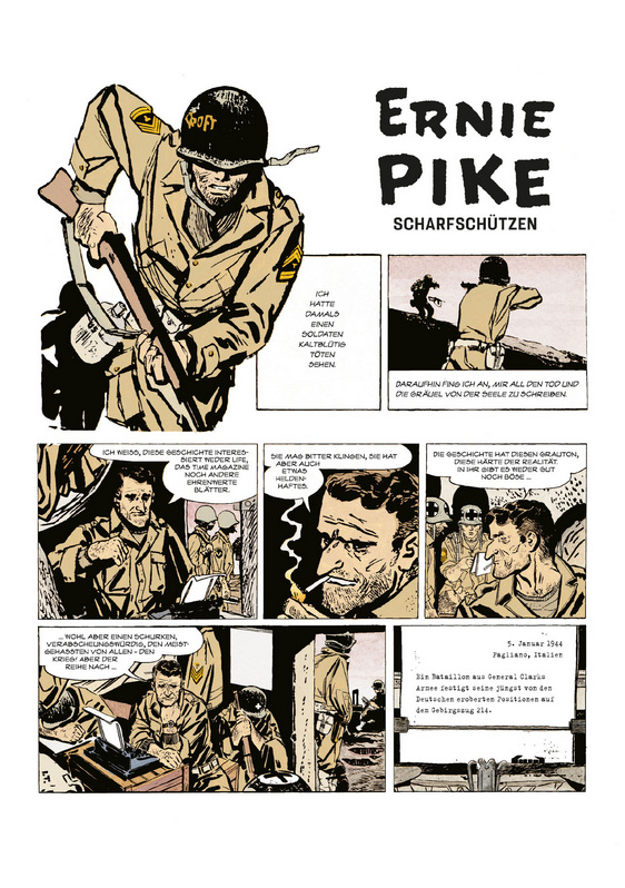 Inspiriert von der Figur des amerikanischen Kriegsberichterstatters Ernie Pyle schufen Oesterheld und Pratt 1957 in Argentinien die Figur des Ernie Pike: ein Journalist, an die Schrecken des Schlachtfelds gewöhnt, aber entschlossen, seine Menschlichkeit zu verteidigen und zu bewahren. In seinen Händen hält er keine Waffe, sondern ein Notizbuch, in dem er Geschichten und Zeugnisse aus den Schützengräben der halben Welt sammelt. Verrat, Mut, Flucht oder Heldentum, nichts entgeht dem scharfen Blick dieses Zeitzeugen des Krieges.