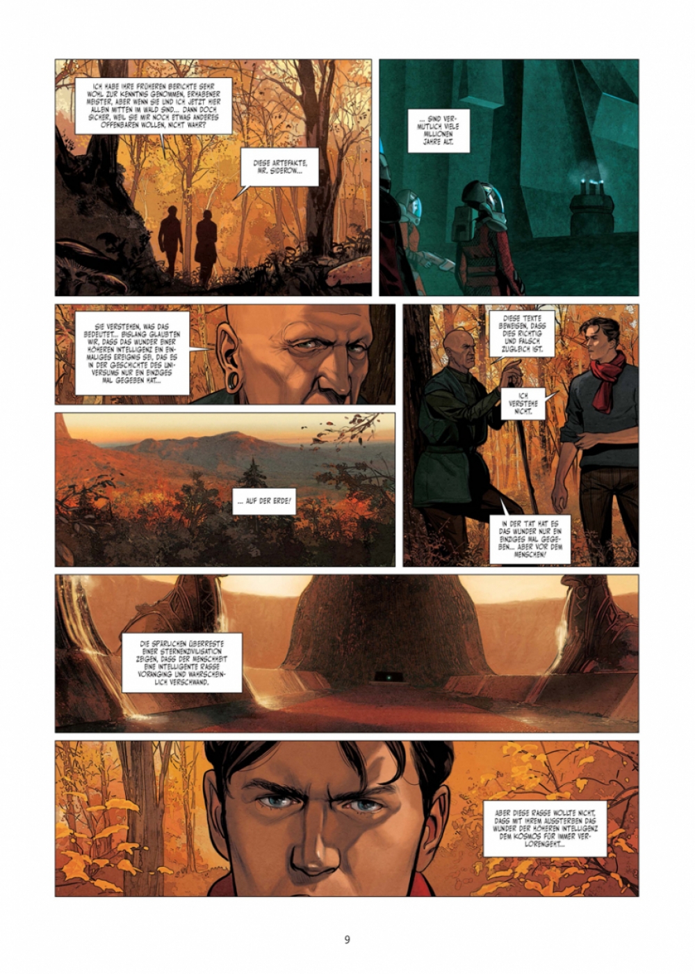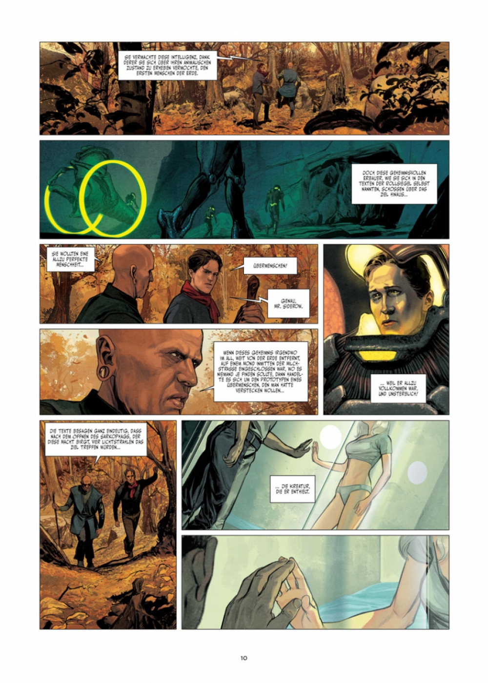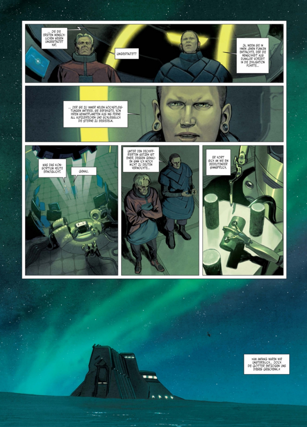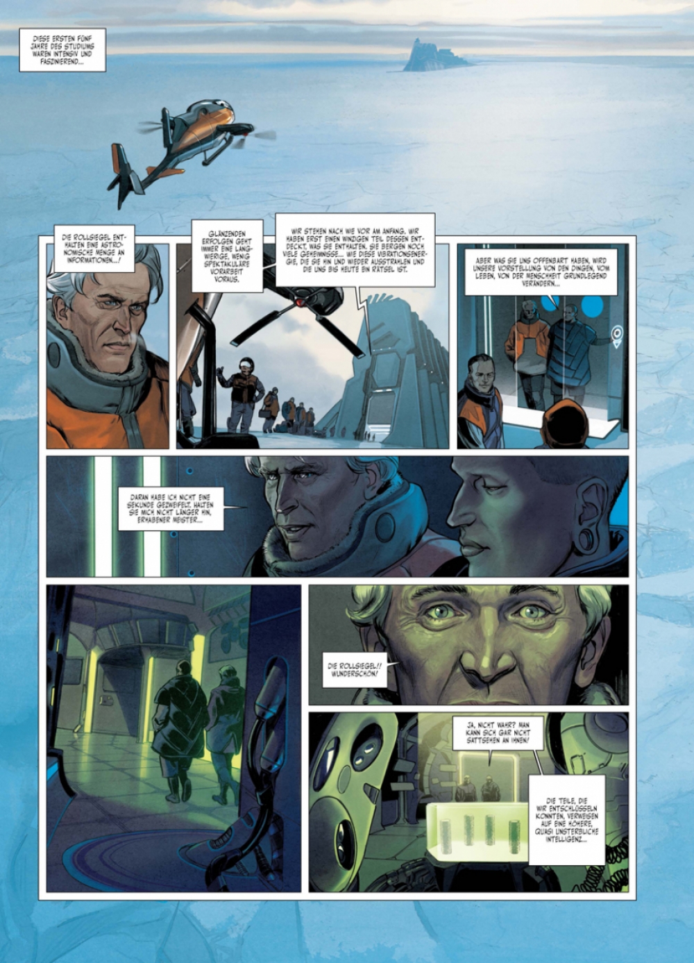 Christophe Bec (u. a. »Prometheus«, »Siberia 56«) und Zeichner Jaouen haben sich ganz bewusst entschieden, ein beliebtes, geradezu klassisches Motiv des SF-Kinos der 70er-/80er-Jahre wiederaufzugreifen, von »2001« bis »Alien«: die unerwartete Konfrontation mit einer extraterrestrischen Existenz, letztlich eine Begegnung der unverstandenen Art. Jaouen verwendet dafür denn auch in Blau, Grün und Dunkelheit getauchte Bilder von nüchterner Schönheit, die beides verkörpern, Faszination wie Erschrecken angesichts der unfassbaren Dimensionen im All. Aber deshalb innehalten, aufgeben oder gar zurückweichen? Niemals...