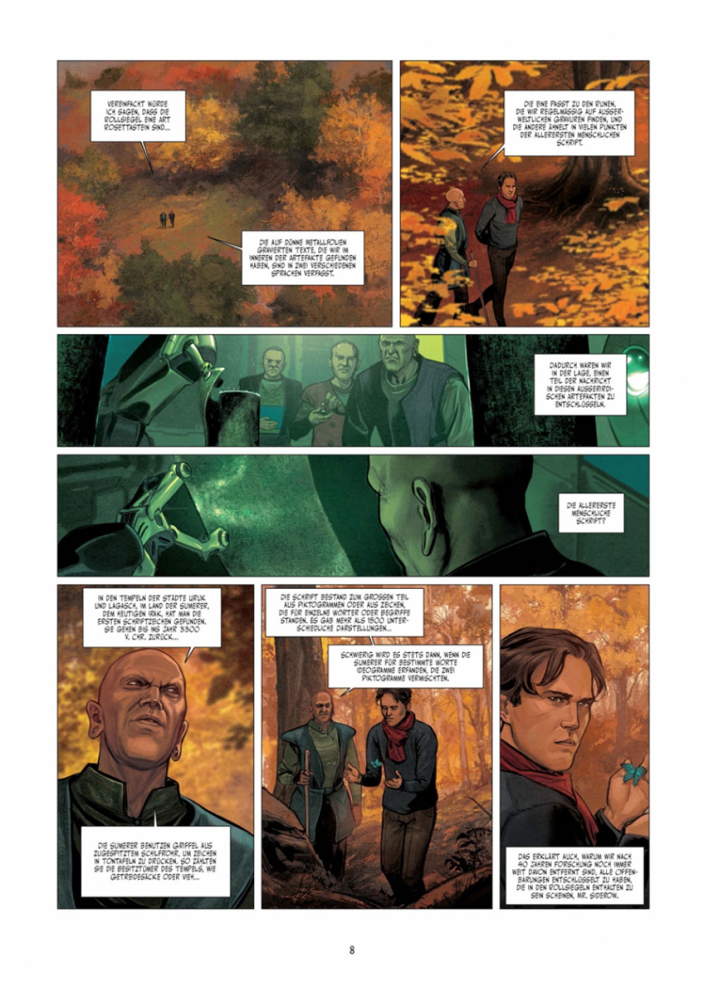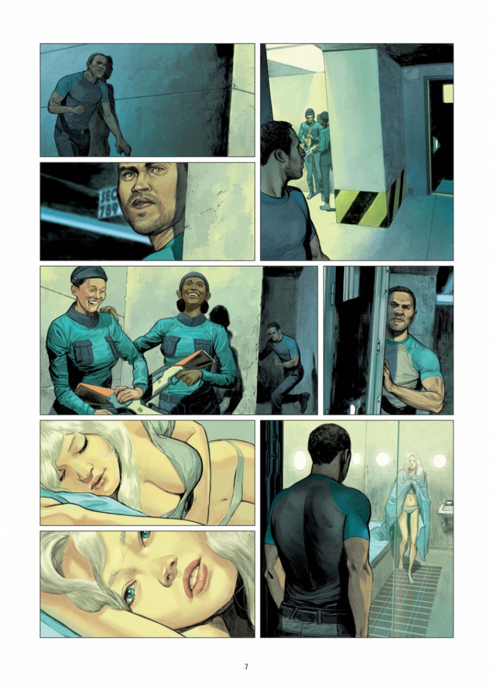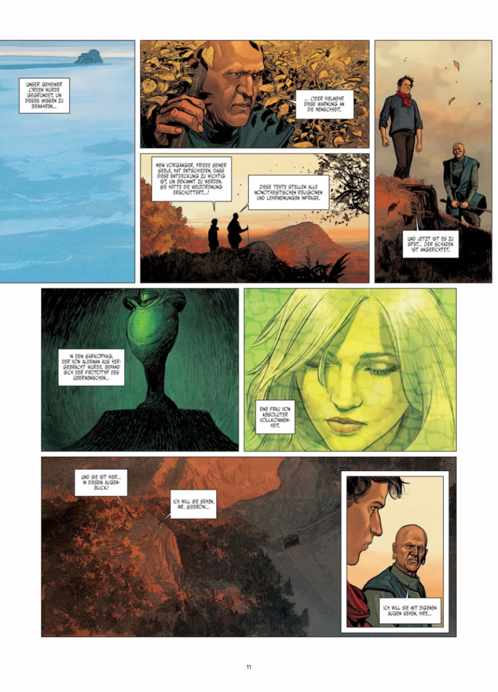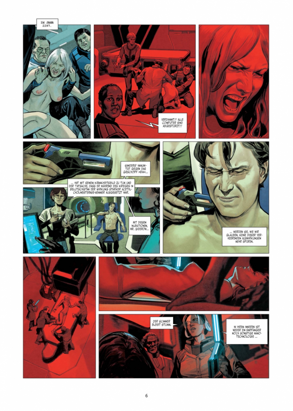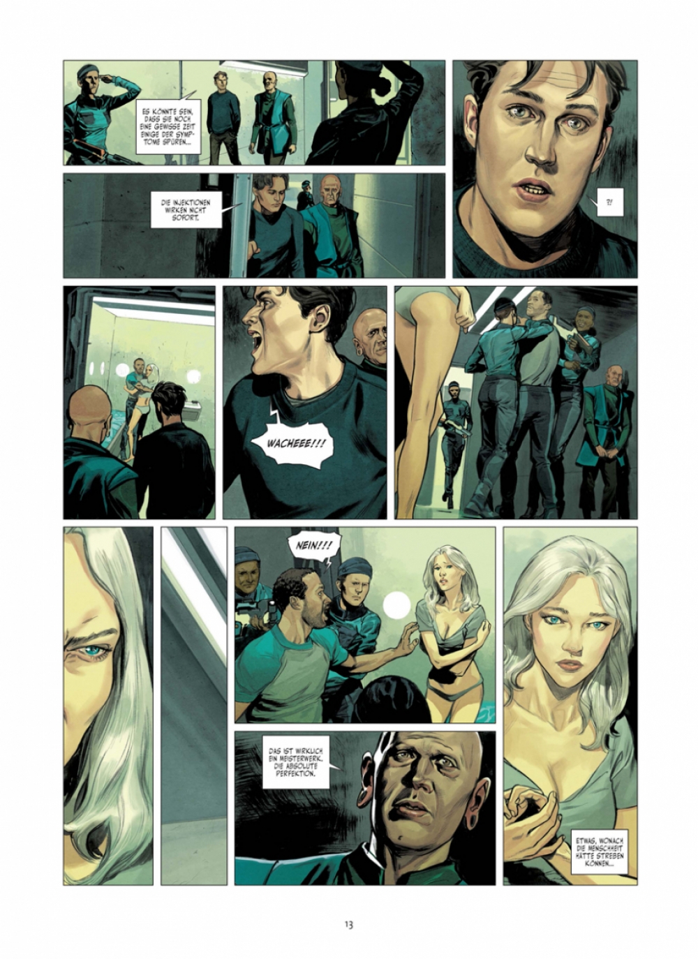 Christophe Bec (u. a. »Prometheus«, »Siberia 56«) und Zeichner Jaouen haben sich ganz bewusst entschieden, ein beliebtes, geradezu klassisches Motiv des SF-Kinos der 70er-/80er-Jahre wiederaufzugreifen, von »2001« bis »Alien«: die unerwartete Konfrontation mit einer extraterrestrischen Existenz, letztlich eine Begegnung der unverstandenen Art. Jaouen verwendet dafür denn auch in Blau, Grün und Dunkelheit getauchte Bilder von nüchterner Schönheit, die beides verkörpern, Faszination wie Erschrecken angesichts der unfassbaren Dimensionen im All. Aber deshalb innehalten, aufgeben oder gar zurückweichen? Niemals...