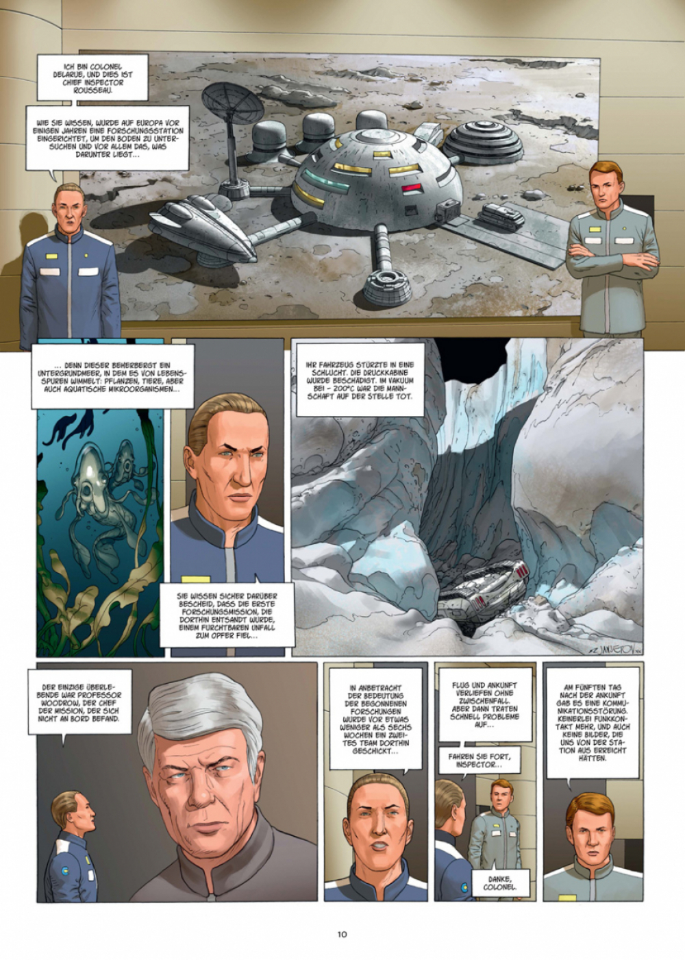 Europa, der vierte Mond des Gasriesen Jupiter, ist ein hochinteressanter Trabant. Vollständig von einer kilometerdicken Eisschicht bedeckt, könnte sein Ozean das beherbergen, wonach die Menschheit schon so lange sucht: extraterrestrisches Leben. Eine kleine wissenschaftliche Station widmet sich unter widrigsten Bedingungen der Erforschung des Mondes. Als von dort ungewöhnliche Ereignisse gemeldet werden, entsendet die Erde ein Team, um der Sache auf den Grund zu gehen. Der Beginn eines neuen Science-Fiction-Abenteuers à la Leo!