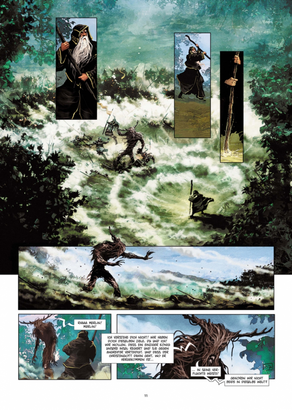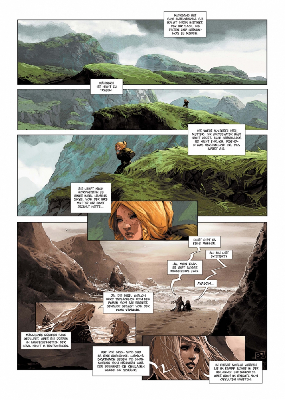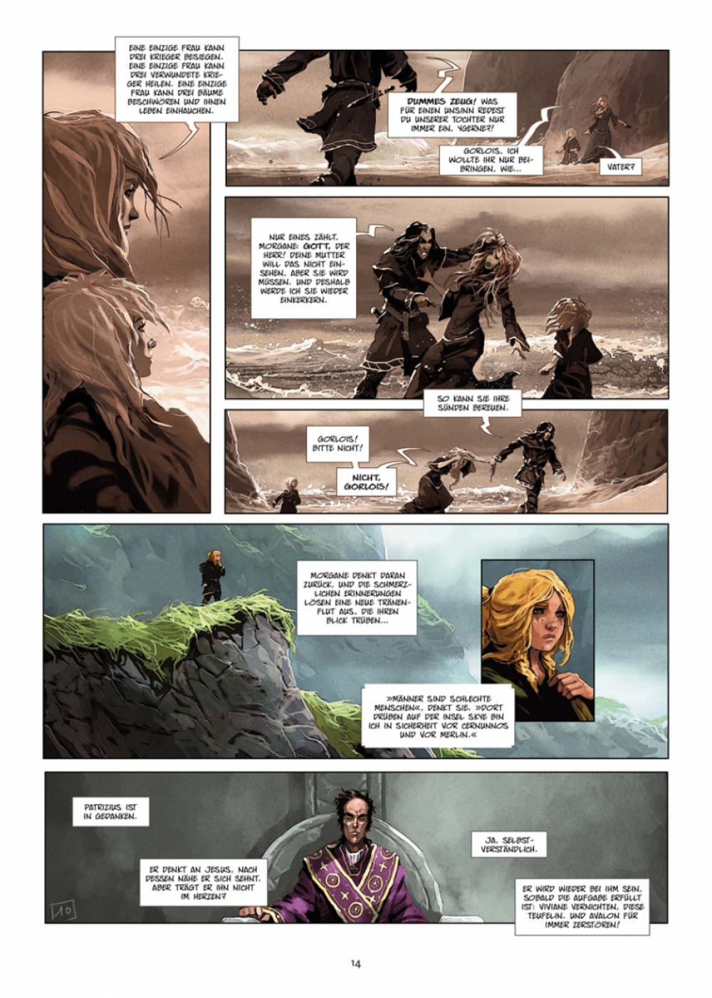 Dieses Schwert ist die Verlängerung des Willens von Avalon. Der, der es führt, spricht im Namen der heiligen Insel. Merlin ein alter seherischer, aber nicht unfehlbarer Druide. Uther Pendragon, ein junger Rohling, der lernt ein wahrer König zu werden. Ygraine, eine Frau, geschlagen für ihre religiösen Überzeugungen. Gorlois, ein perverser Sadist von fanatischer Gottesfurcht und Henker seiner Frau. Und Morgane, ein bezauberndes Kind, das Dinge sieht, die sonst niemand sieht, nicht einmal Merlin. Ein Kind das darunter leidet zu wissen, dass es unweigerlich eines Tages böse sein wird.