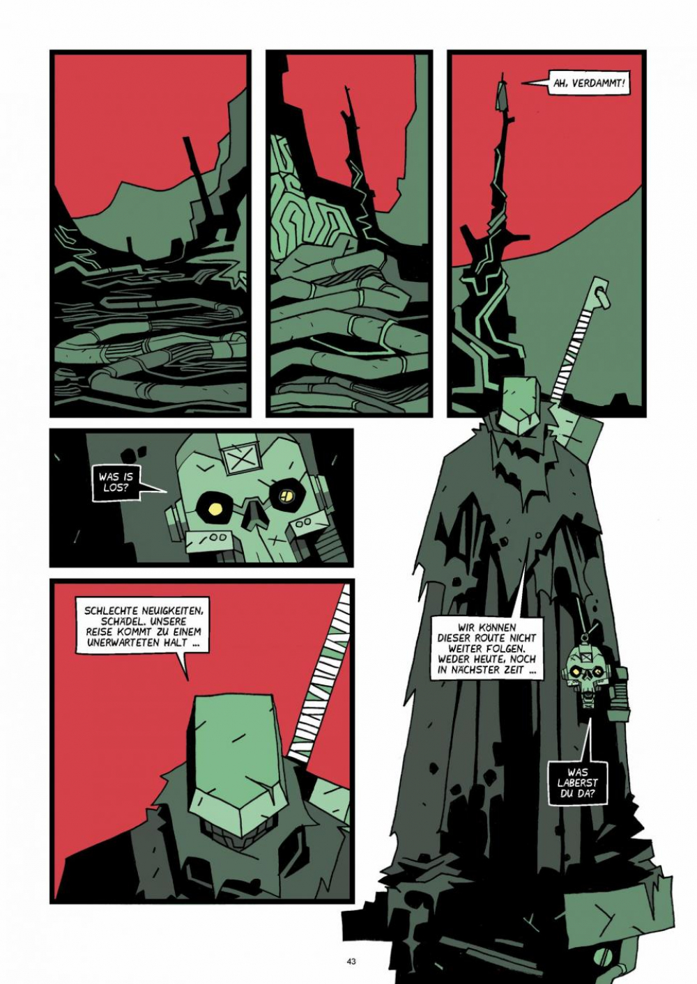 Robot und Schädel ziehen durch apokalyptische Techno-Landschaften, bewaffnet mit einem scheißgroßen Schwert - Big Ass Sword eben!