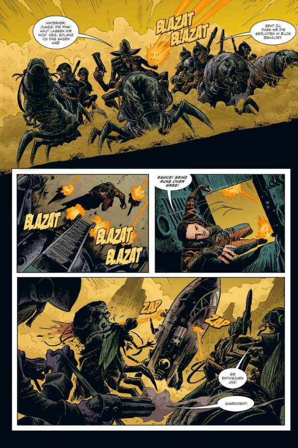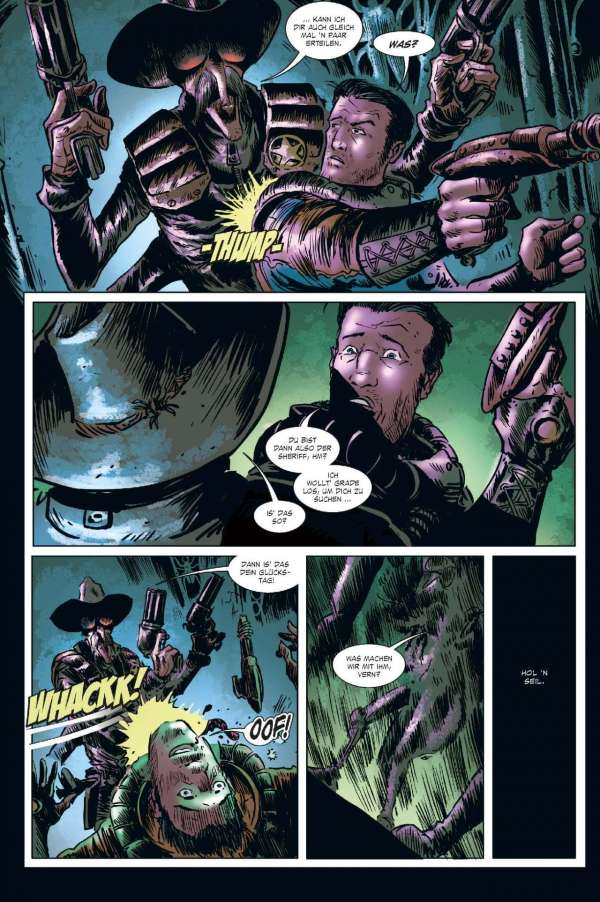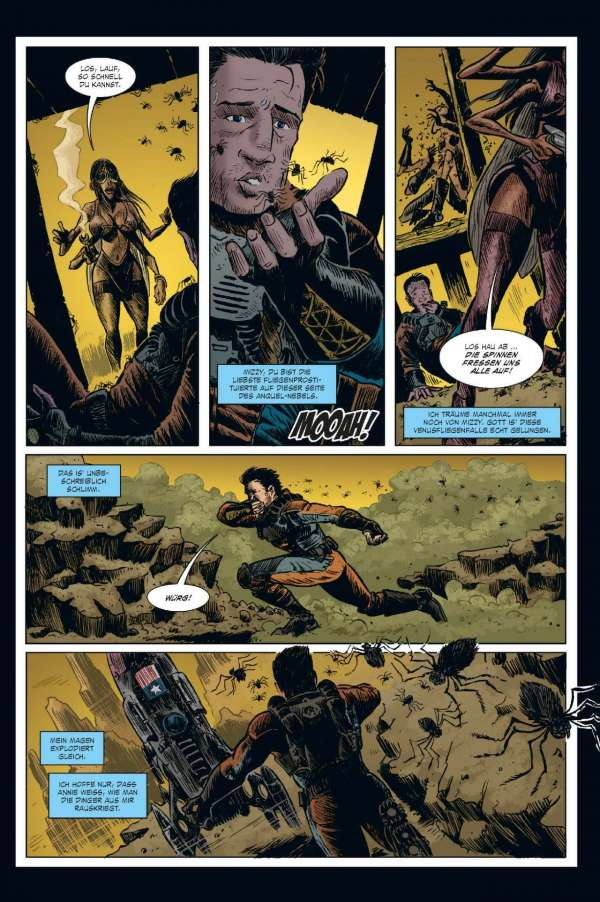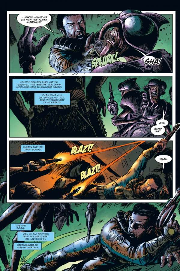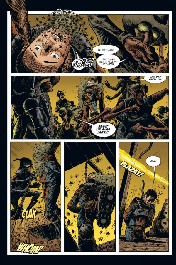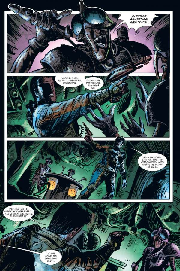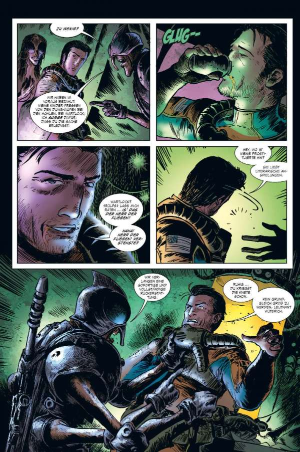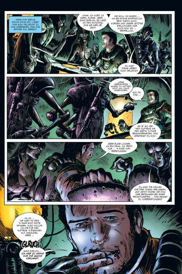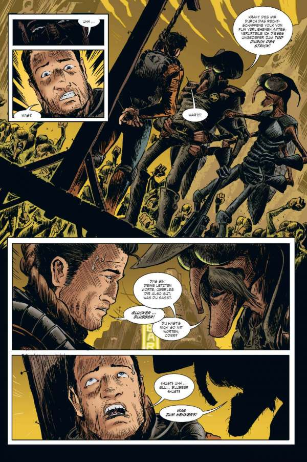 Euch geht so eine Rasse gieriger außerirdischer Bürokraten, die den Hals nicht vollkriegen können, gehörig auf den Sack? Wollen die Alien-Typen vielleicht eine ganze Sonne ihrer Energie berauben und damit ein ganzes Sonnensystem zum Tode verdammen? Dann braucht ihr einen Fear Agent! Einen Hardcore-Alien-Vernichter – einen wie Heath Huston, der die Dinge für euch richtigstellt. Okay. Sicher. Normalerweise ist Heath voll wie 'ne Haubitze, kann nicht mehr ganz gerade schießen und flucht genug, um kleinen grünen Männchen die Schamesröte in die hässlichen Alien-Gesichter zu treiben ... Aber ... Hey! In einem so verkorksten Universum ist er genau der richtige Mann für den Job. Der vierte und letzte FEAR AGENT-Band enthält eine Sammlung von Geschichten aus dem FEAR AGENT-Universum – mit Beiträgen von Künstlern wie Chris Burnham (BATMAN, NAMELESS, DIE! DIE! DIE!), Rafael Albuquerque (AMERICAN VAMPIRE), Kieron Dwyer (XXXOMBIES), Francesco Francavilla (ARCHIE), Ivan Brandon (VS), Eric Nguyen (HALO) und vielen mehr!