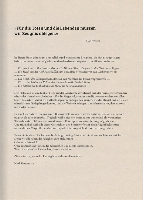 Neal Shusterman, Gewinner des National Book Awards, erzählt fünf Geschichten über die Shoah. Er erzählt von Träumen, wo träumen nicht mehr möglich ist, und lässt Augenblicke echten menschlichen Mitgefühls aufleuchten. Denn die Kraft der Vorstellung ist unser mächtigstes Werkzeug für die Zukunft, auch wenn wir die Vergangenheit nicht ändern können. In einer Zeit des wiederauflebenden Antisemitismus setzt der Bestsellerautor, der selbst jüdischer Abstammung ist, ein Zeichen gegen Hass und Gewalt. Die bewegendste Graphic Novel über den Holocaust seit Art Spiegelmans Maus.