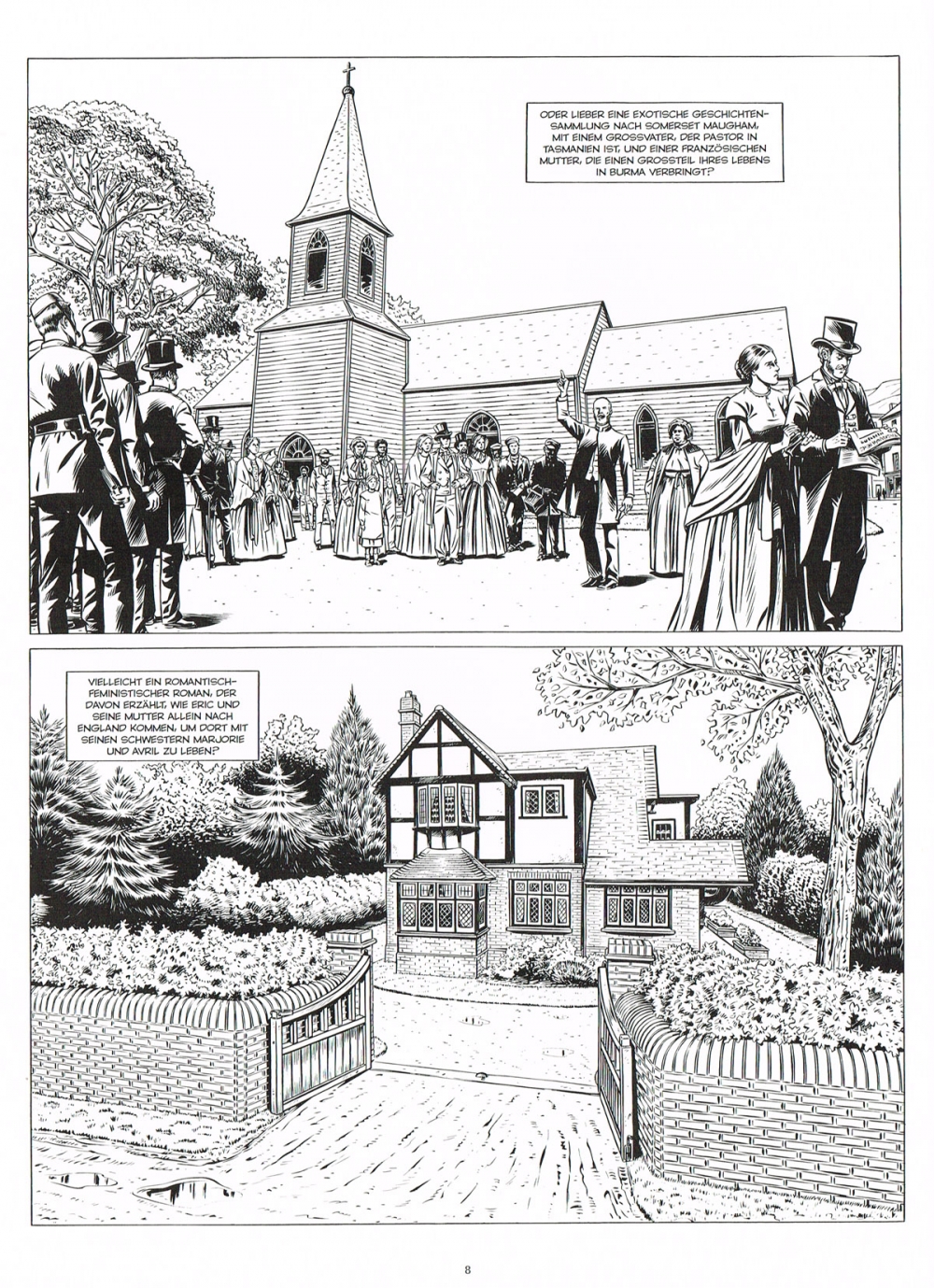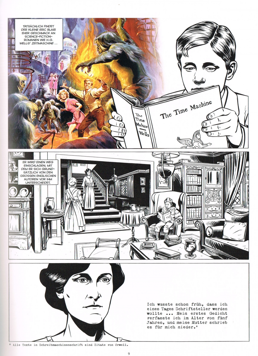 Mit diesem fein gezeichneten, klassisch-realistischen Comic setzen Sébastien Verdier und Pierre Christin dem Kultautor ein Denkmal. Illustrationen von Annie Goetzinger, Juanjo Guarnido, Enki Bilal, Manu Larcenet, Blutch und André Juillard stellen die einzelnen Werke Orwells vor.