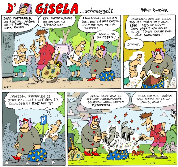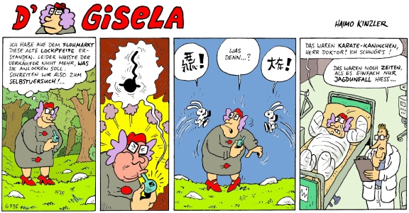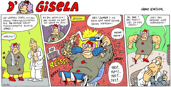 Mit Gisela hat Haimo Kinzler eine ganz ungewöhnliche Comicheldin geschaffen: Eine schwäbische Hausfrau, die mit Witz und Humor den Alltag und die Abenteuer meistert.