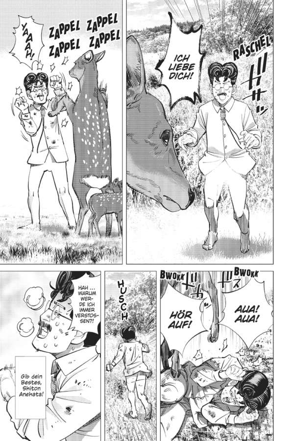 Auf ihrer langen Reise auf der Suche nach dem Gold der Ainu haben Sugimoto und seine Freunde schon einige verdrehte Personen getroffen. Aber keiner von ihnen war so gestört wie der perverse Tierliebhaber Anehata. Und eines ist klar: diesen Verrückten vor sich selbst zu retten, wird ein ganz schönes Stück Arbeit!
