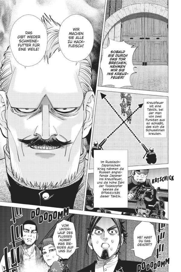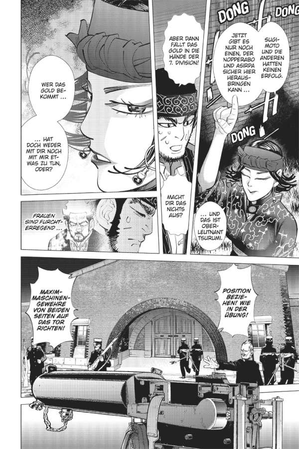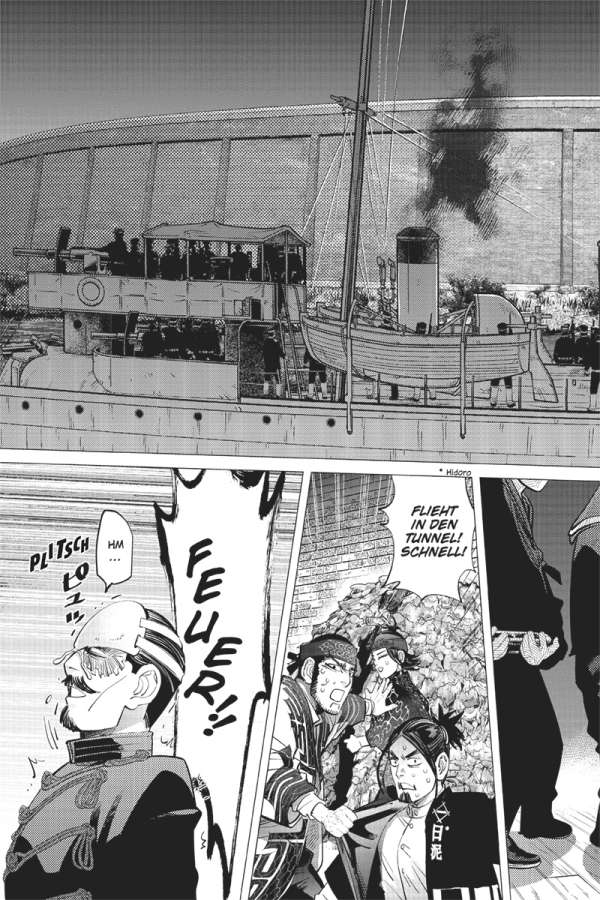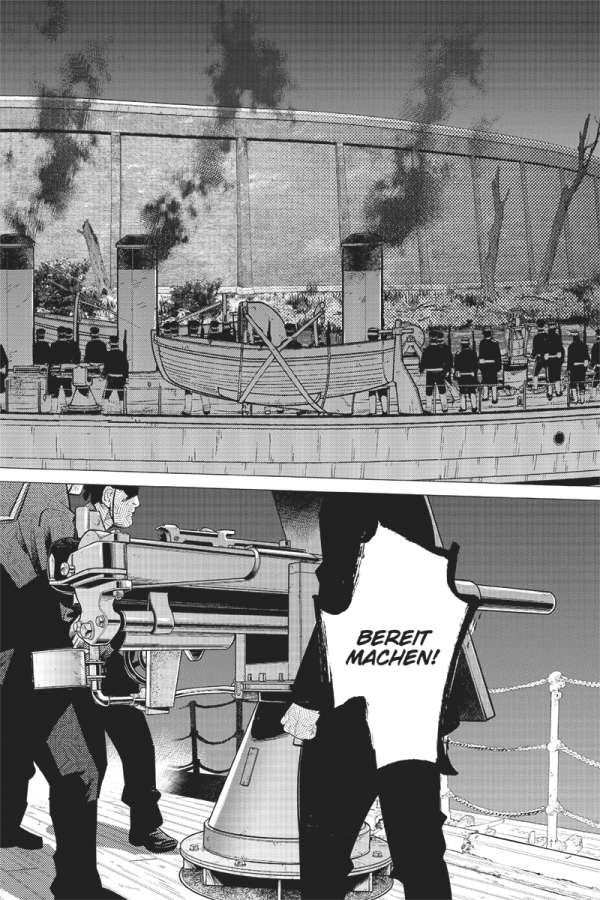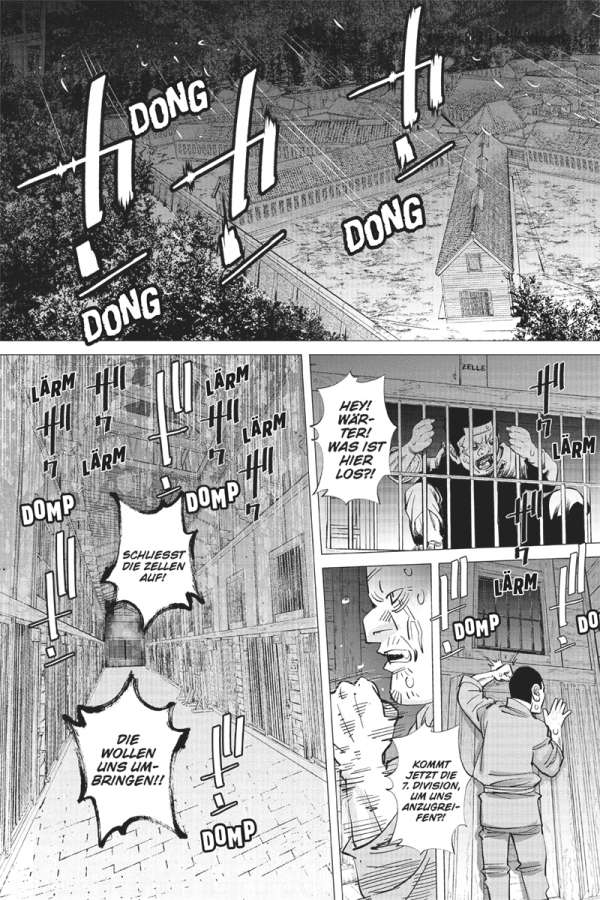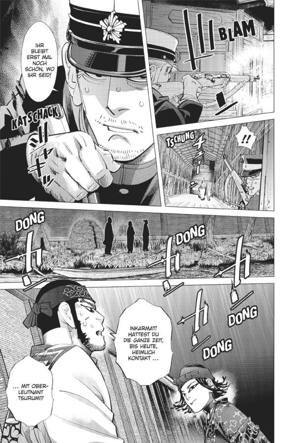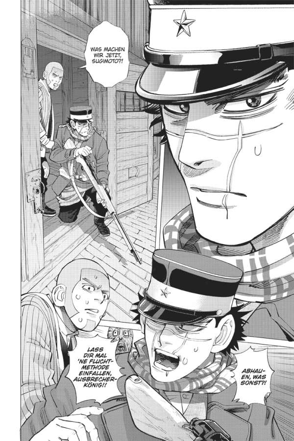 Nachdem sie endlich ins Innere des Abashiri-Gefängnisses eindringen konnten, stehen Sugimoto und Asirpa nun dem Mann gegenüber, der das Gold der Ainu gestohlen haben soll: Nopperabo. Oder auch nicht, denn ein Betrüger hat heimlich dessen Platz eingenommen und schlägt Alarm! Hals über Kopf müssen die beiden also irgendwie aus dem Gefängnis fliehen, doch draußen erwartet sie bereits der grausame Leutnant Tsurumi …
