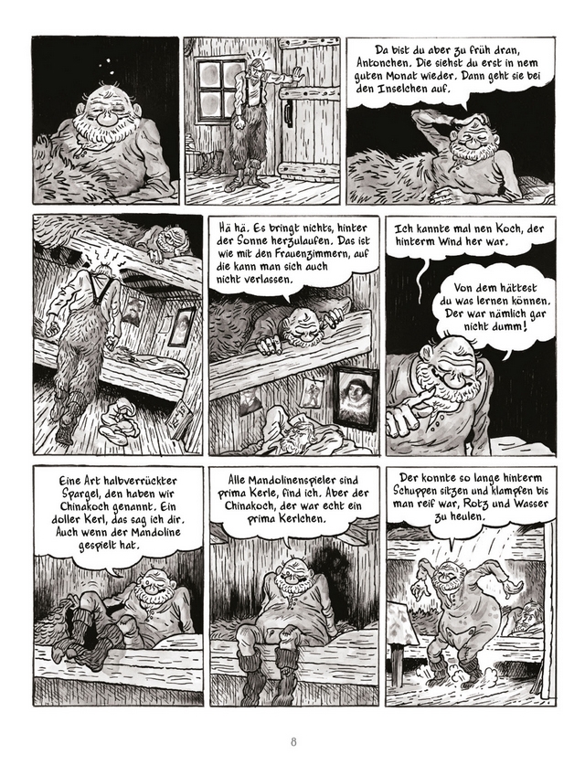 Hier liegt eine weit umspannende Erzählung über eine Gruppe von Männern in kalter, unwirtlicher Umgebung vor, unterteilt in mehrere Abschnitte.