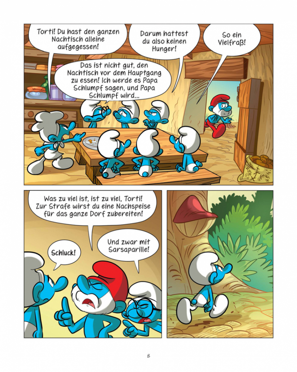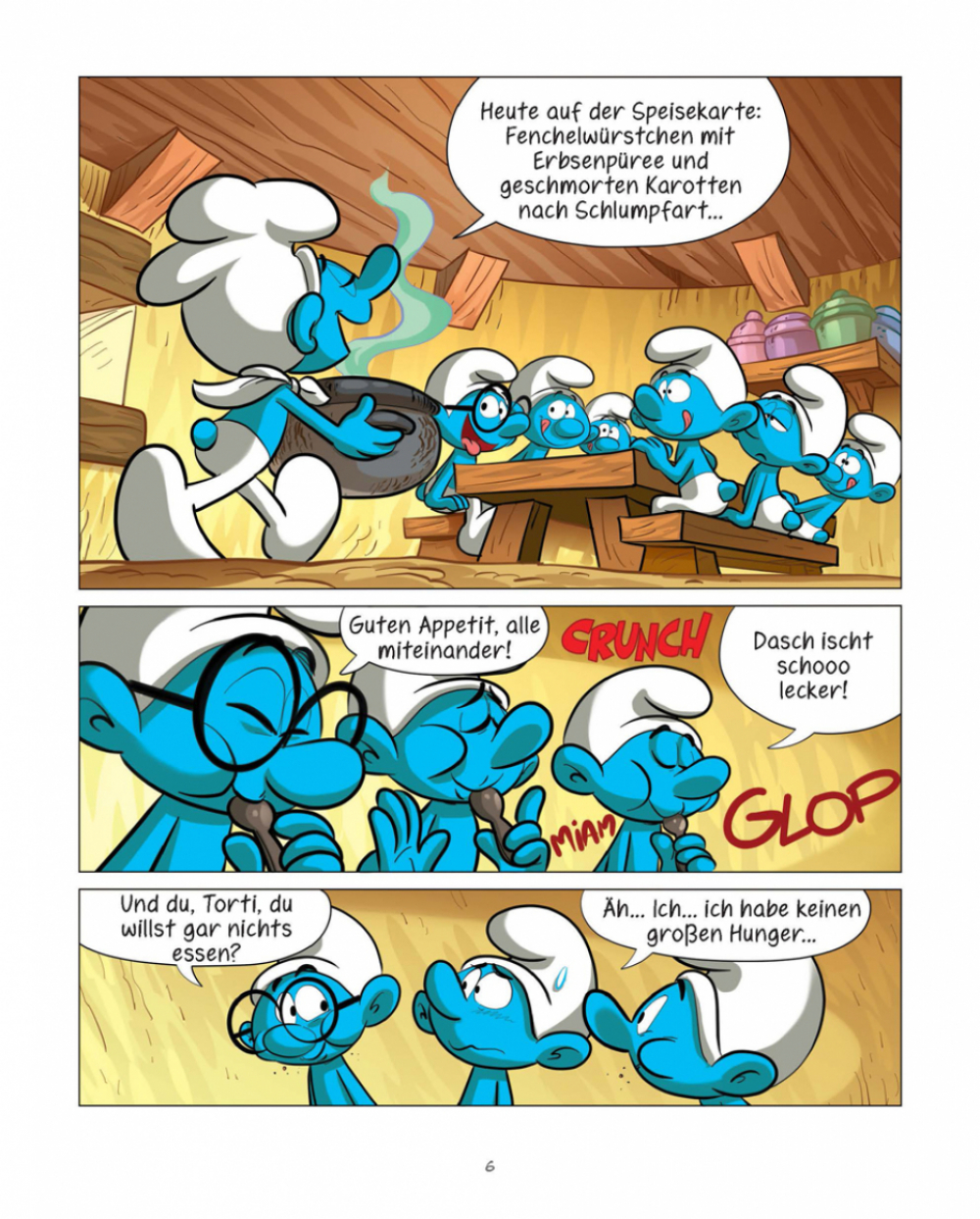Es ist Essenszeit, aber Torti hat gar keinen Hunger... denn er hat schon den gesamten Nachtisch von Schlumpfhausen aufgegessen! Jetzt kriegen die anderen Schlümpfe nichts vom leckeren Himbeermus ab! So geht das nicht weiter, meint Papa Schlumpf, und verdonnert Torti zum Kochdienst, sodass er für alle anderen Schlümpfe kochen muss. Gar nicht so einfach, vor allem, wenn Gargamel sich einmischt...