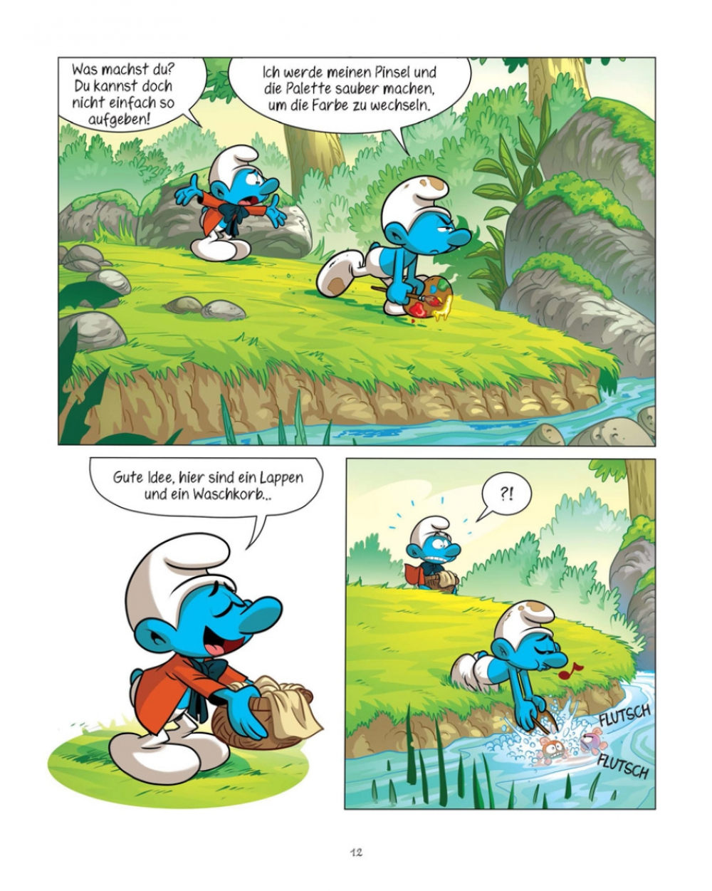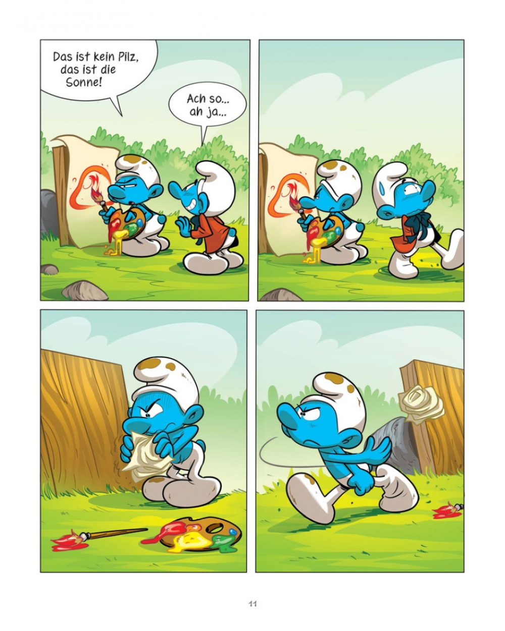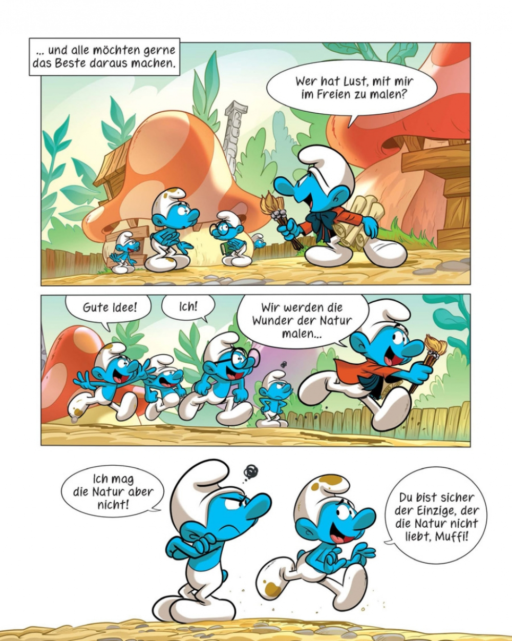 Wie schön ist ein Picknick im Grünen oder ein Bild, gemalt in freier Natur! Aber man sollte dabei keine Reste hinterlassen. Der Schmutzschlumpf hat noch nicht richtig verstanden, dass man besser nichts einfach so in die Landschaft wirft. Zum Glück sind da die anderen Schlümpfe, die ihm erklären, dass die Umwelt kein großer Mülleimer ist.