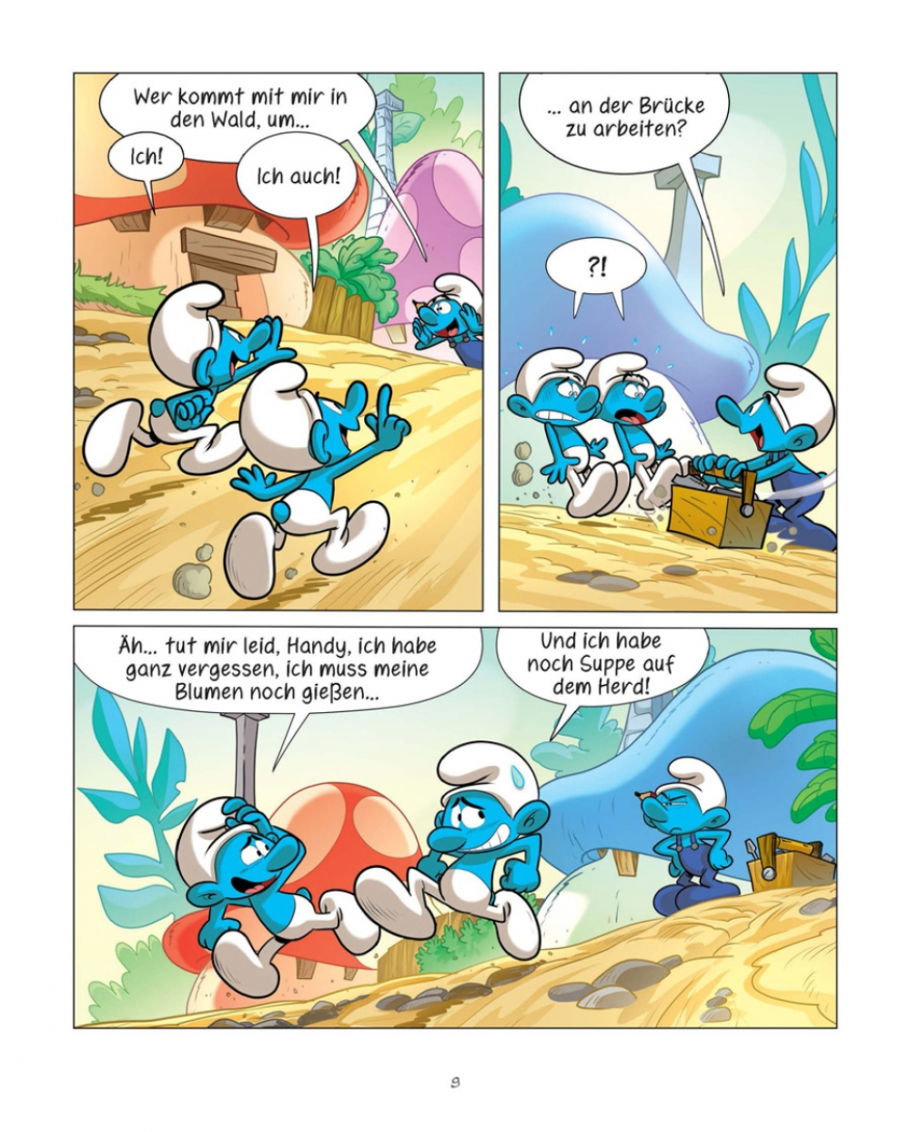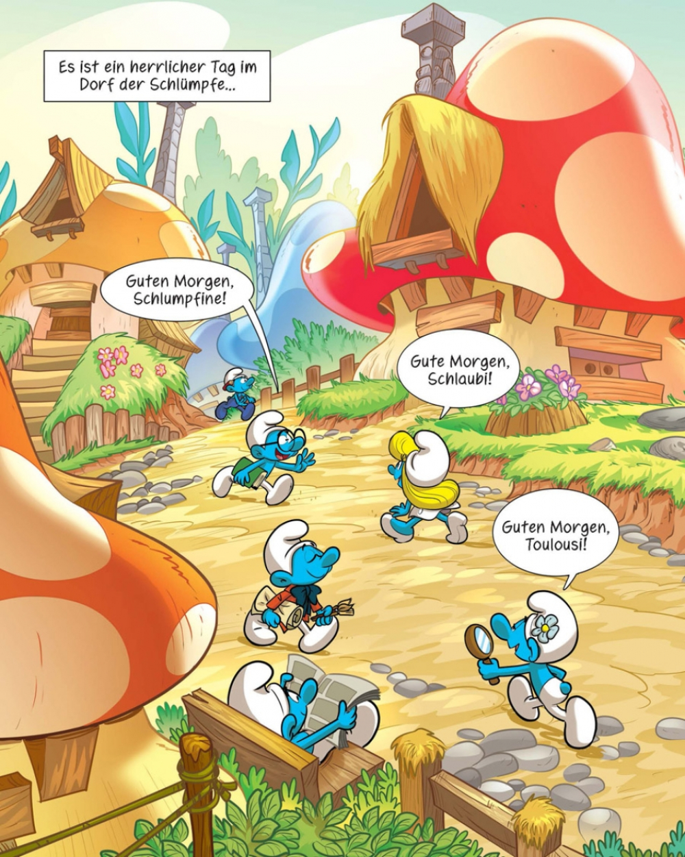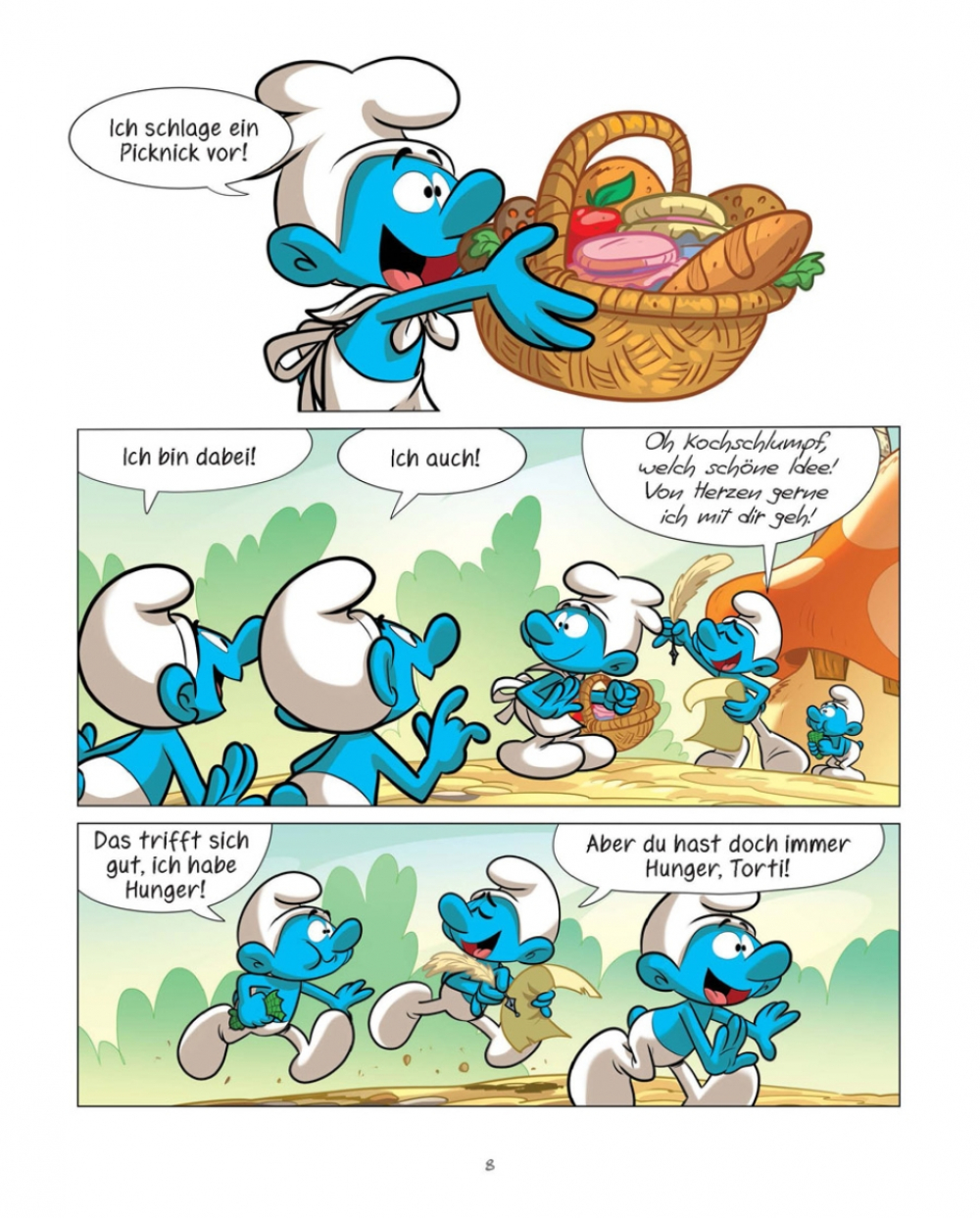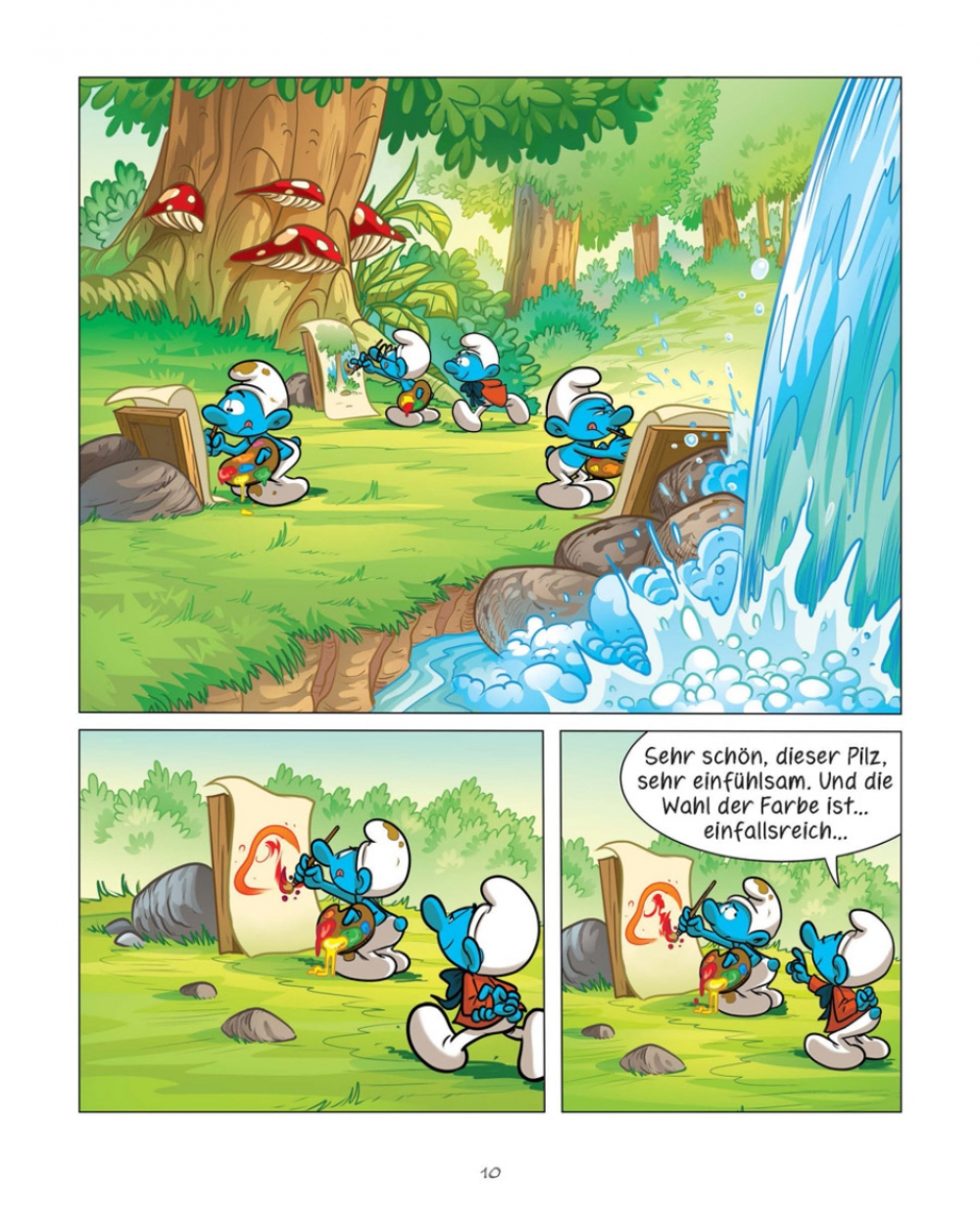 Wie schön ist ein Picknick im Grünen oder ein Bild, gemalt in freier Natur! Aber man sollte dabei keine Reste hinterlassen. Der Schmutzschlumpf hat noch nicht richtig verstanden, dass man besser nichts einfach so in die Landschaft wirft. Zum Glück sind da die anderen Schlümpfe, die ihm erklären, dass die Umwelt kein großer Mülleimer ist.