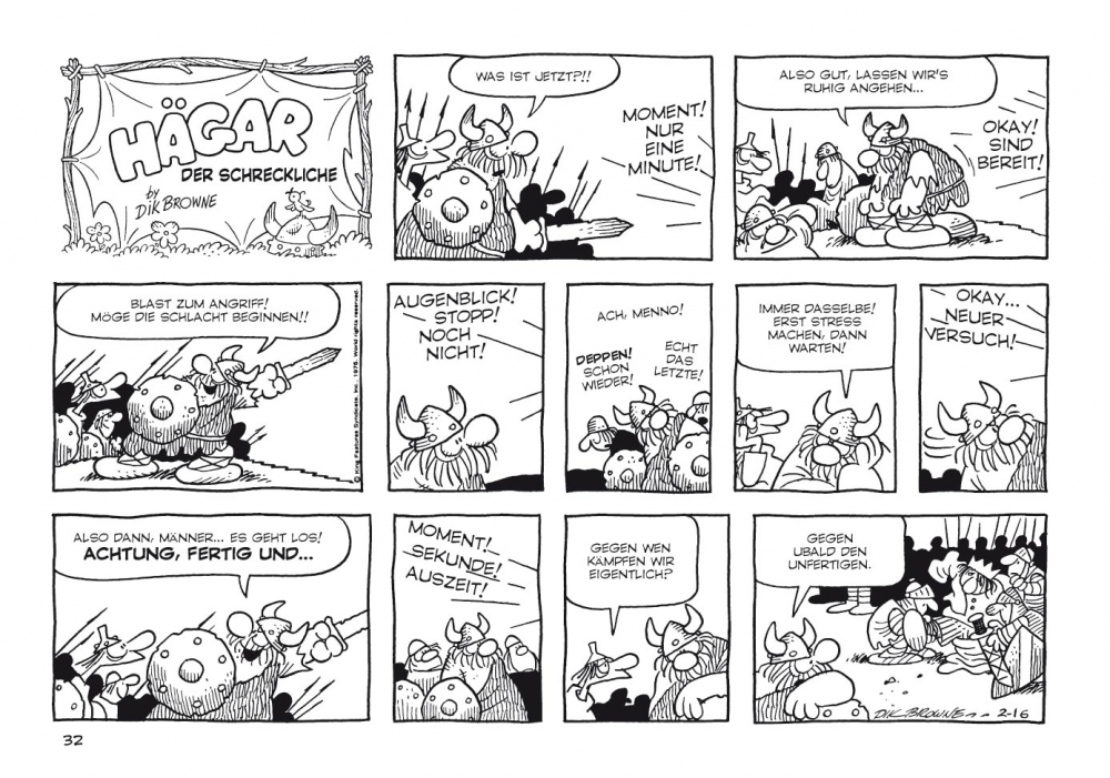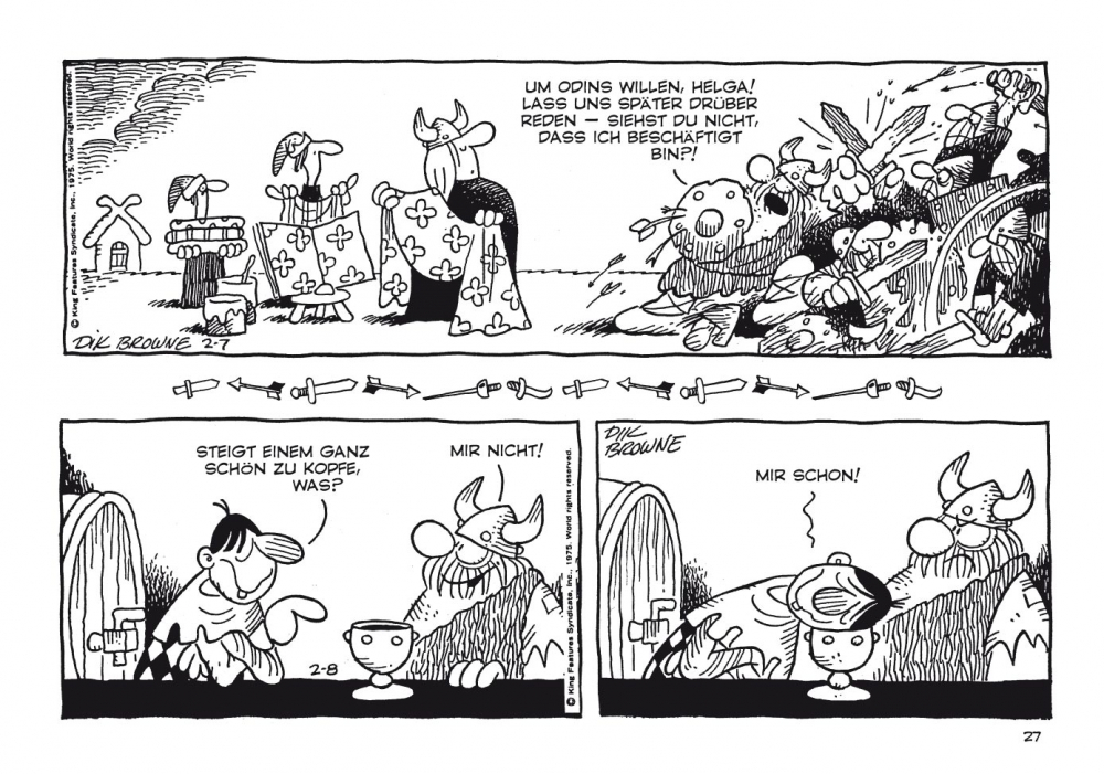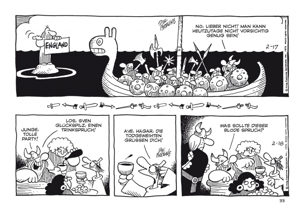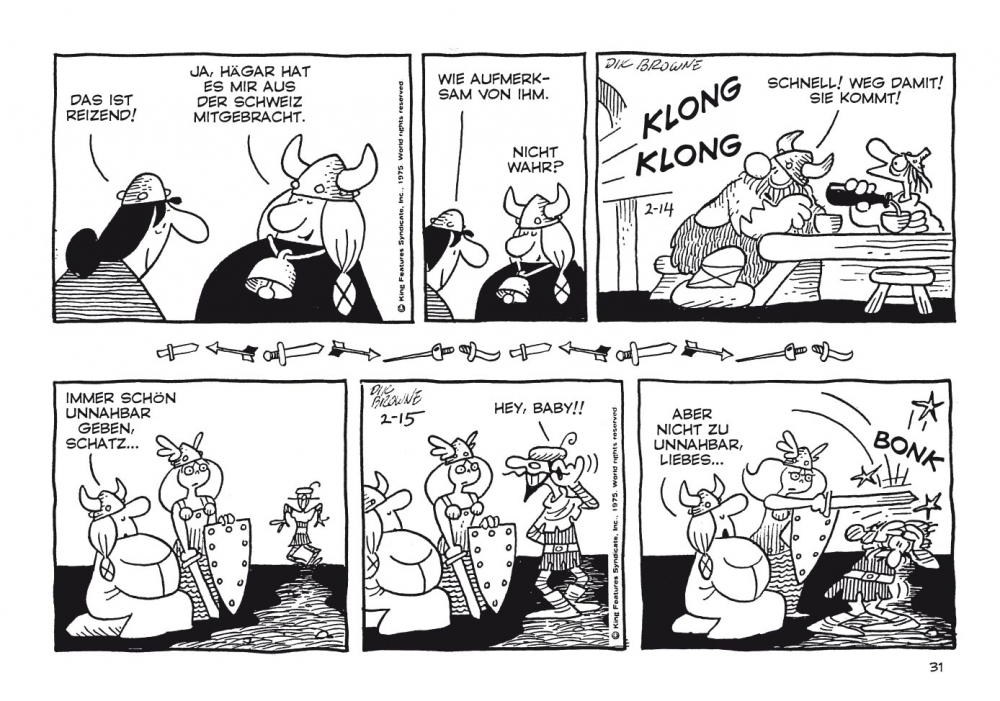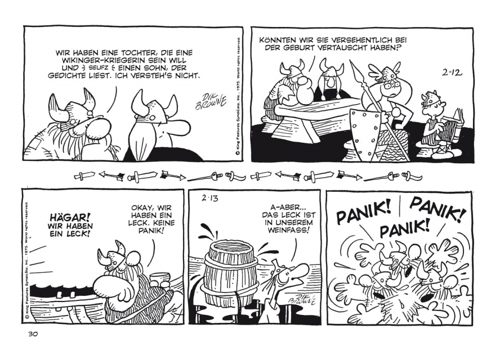 Sein Sohn Hamlet präsentiert sich als Frauenversteher und hält wenig vom Raufen, dafür strebt seine hauswirtschaftlich wenig begabte Tochter Honi eine Karriere als Kriegerin an. Wenig Trost ob seiner aus der Art geschlagenen Kinder findet Hägar bei seiner Gattin Helga, die ihren Mann stets kritisch beäugt. Mangelnde Tischmanieren, Vernachlässigung der Körperhygiene und übermäßiger Alkoholkonsum… Es gibt immer etwas zu beanstanden. Gut, dass ein Wikinger in solchen Fällen die Hörner seines Helms als Ohrenstöpsel benutzen kann!