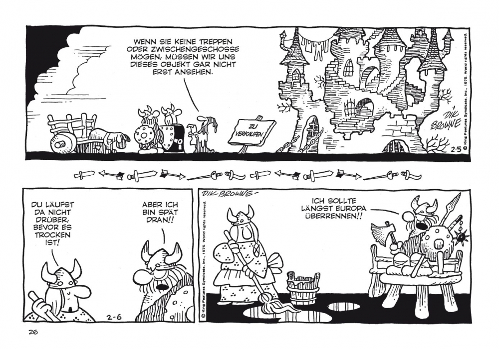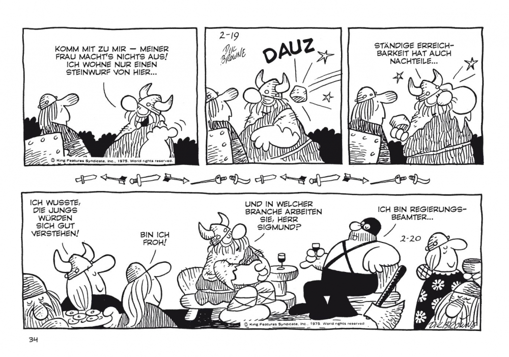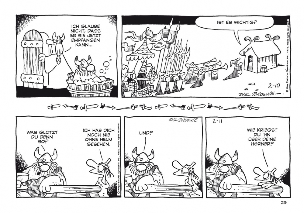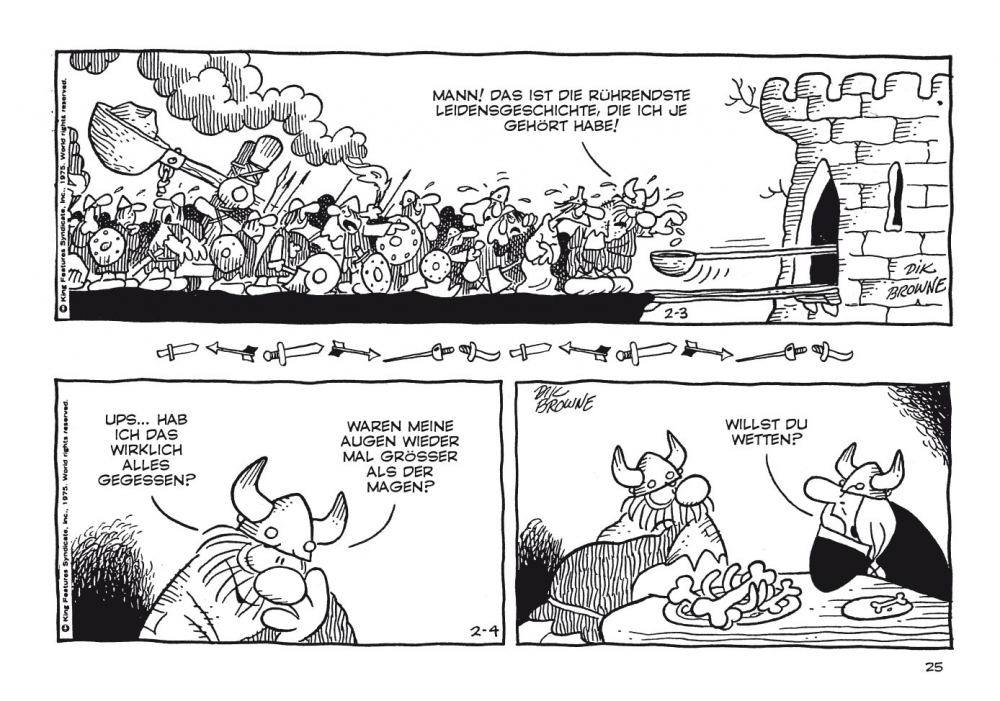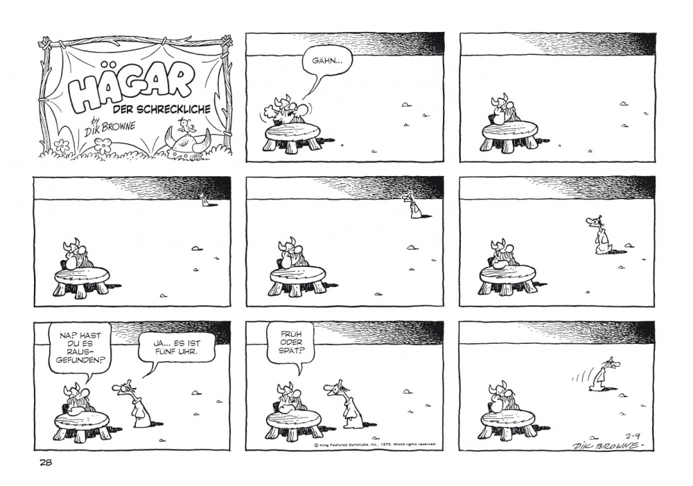 Sein Sohn Hamlet präsentiert sich als Frauenversteher und hält wenig vom Raufen, dafür strebt seine hauswirtschaftlich wenig begabte Tochter Honi eine Karriere als Kriegerin an. Wenig Trost ob seiner aus der Art geschlagenen Kinder findet Hägar bei seiner Gattin Helga, die ihren Mann stets kritisch beäugt. Mangelnde Tischmanieren, Vernachlässigung der Körperhygiene und übermäßiger Alkoholkonsum… Es gibt immer etwas zu beanstanden. Gut, dass ein Wikinger in solchen Fällen die Hörner seines Helms als Ohrenstöpsel benutzen kann!