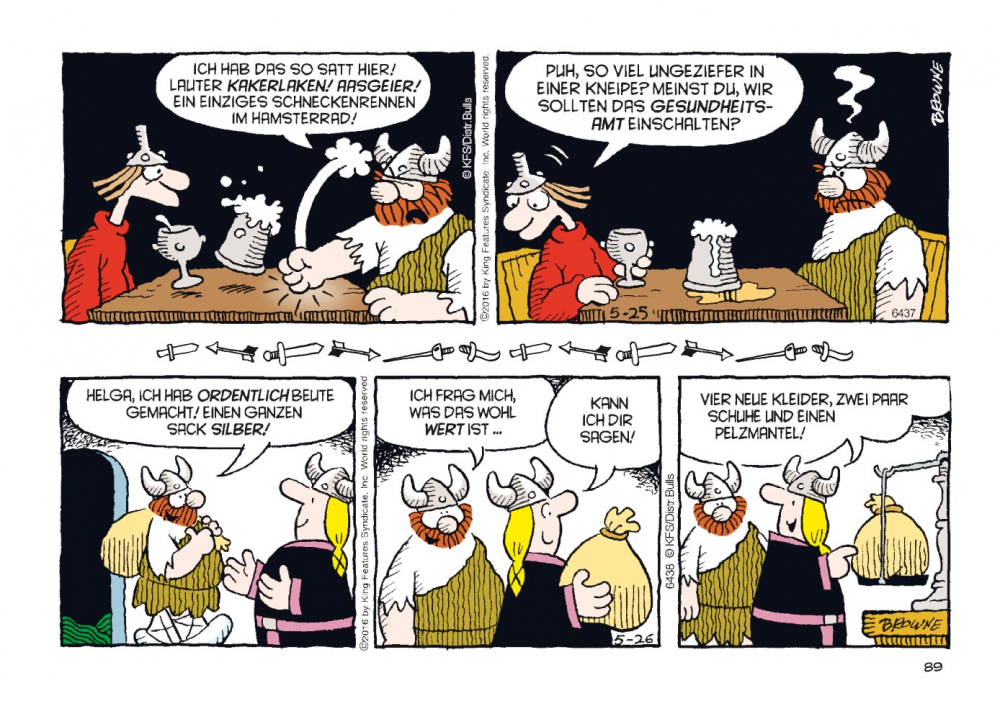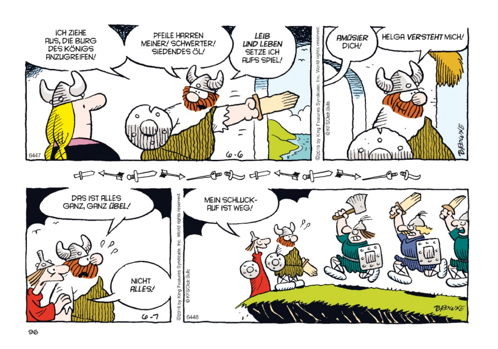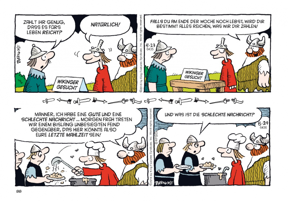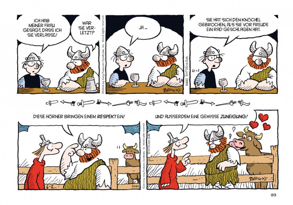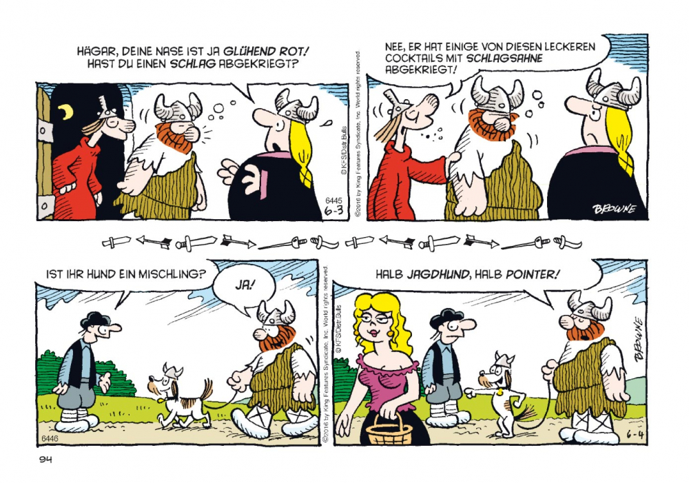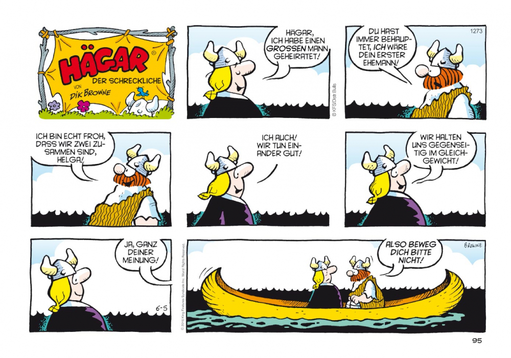Mit Hägar, der Schreckliche hat eine der erfolgreichsten Cartoonserien nun eine neue verlegerische Heimat im All Verlag gefunden. Seit 1973 treibt der in den Berufsfeldern Plündern, Rauben und Brandschatzen erfolgreiche norwegische Geschäftsmann zur Freude von Fans auf der ganzen Welt sein Unwesen. Dabei erweist er sich stets als echter Barbar, der gerne Löffelbiskuit in sein Bier tunkt und ungern badet. Neben seinen beruflichen Verpflichtungen reüssiert Hägar auch als treusorgender Familienvater, wobei es ihm seine Lieben nicht immer leicht machen. Sein Sohn Hamlet präsentiert sich als Frauenversteher und hält wenig vom Raufen, dafür strebt seine hauswirtschaftlich wenig begabte Tochter Honi eine Karriere als Kriegerin an. Wenig Trost ob seiner aus der Art geschlagenen Kinder findet Hägar bei seiner Gattin Helga, die ihren Mann stets kritisch beäugt. Mangelnde Tischmanieren, Vernachlässigung der Körperhygiene und übermäßiger Alkoholkonsum… Es gibt immer etwas zu beanstanden. Gut, dass ein Wikinger in solchen Fällen die Hörner seines Helms als Ohrenstöpsel benutzen kann!