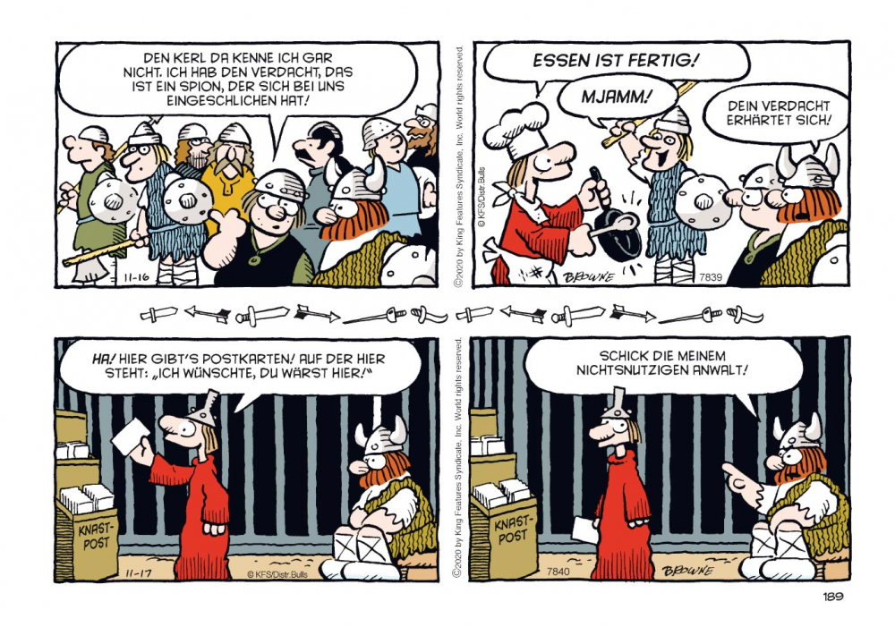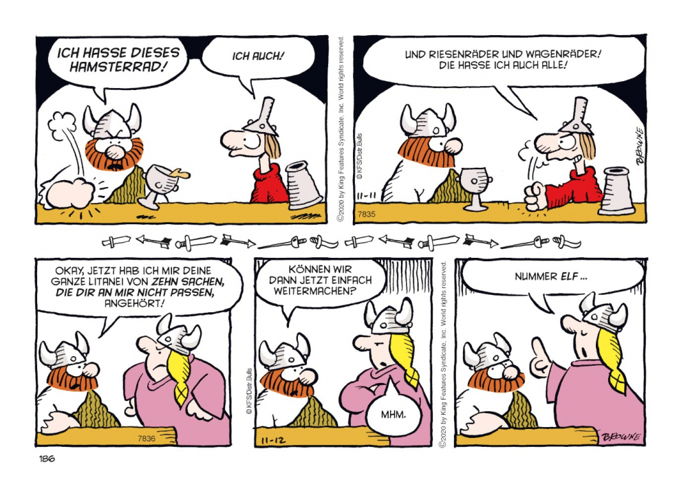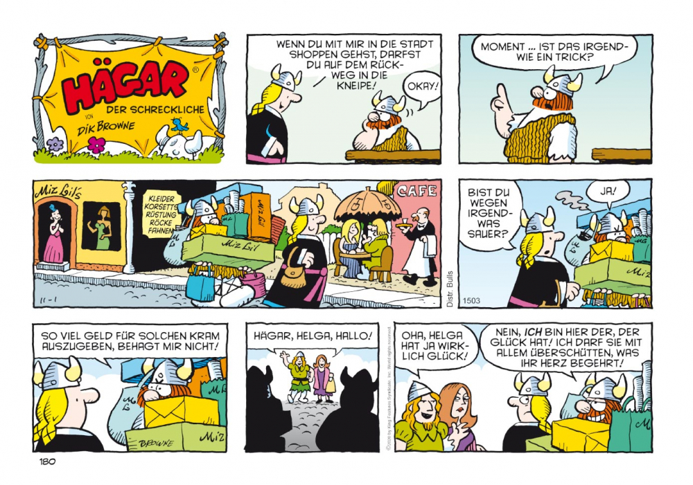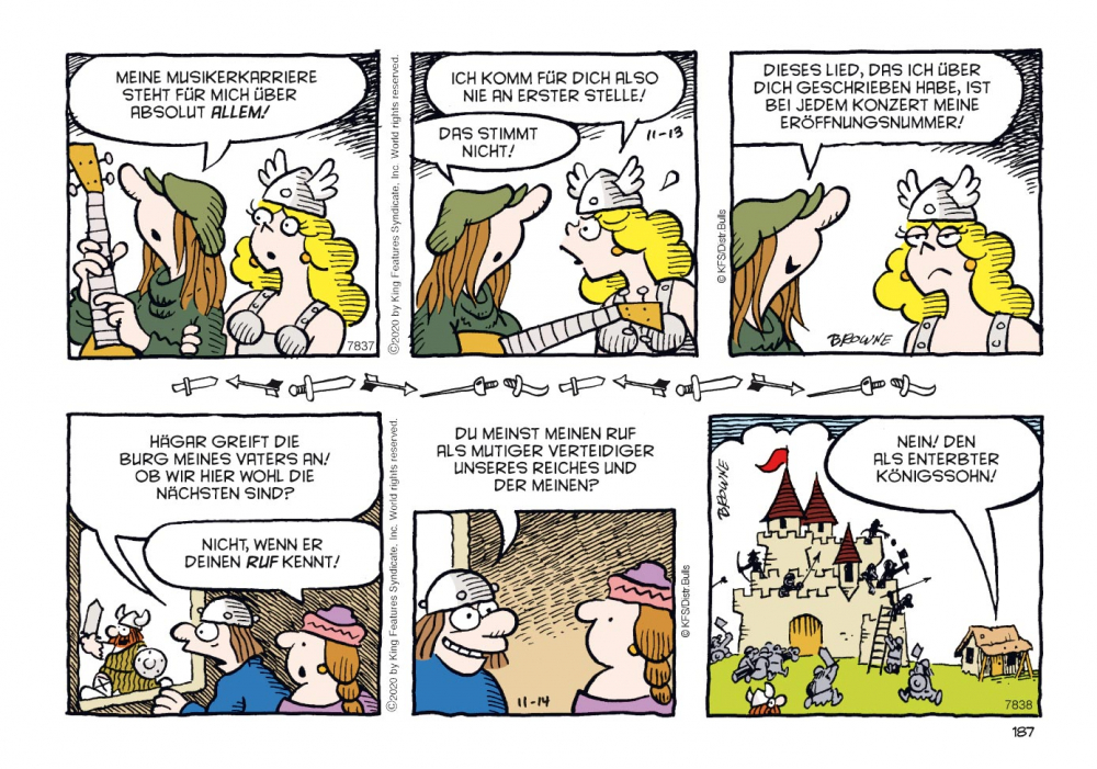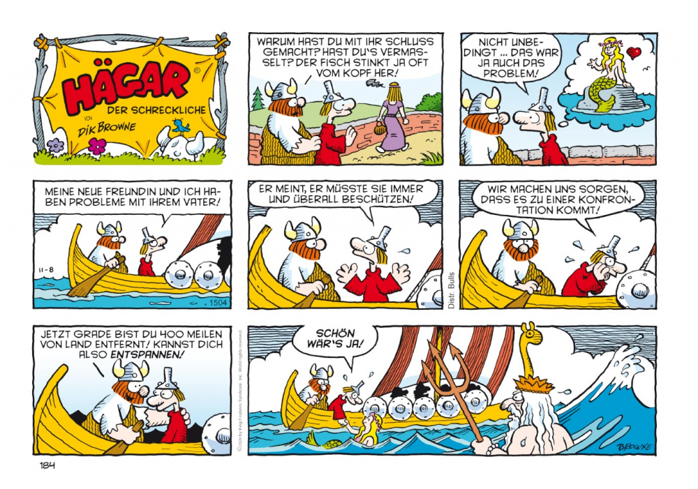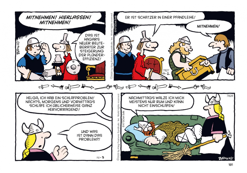 Sein Sohn Hamlet präsentiert sich als Frauenversteher und hält wenig vom Raufen, dafür strebt seine hauswirtschaftlich wenig begabte Tochter Honi eine Karriere als Kriegerin an. Wenig Trost ob seiner aus der Art geschlagenen Kinder findet Hägar bei seiner Gattin Helga, die ihren Mann stets kritisch beäugt. Mangelnde Tischmanieren, Vernachlässigung der Körperhygiene und übermäßiger Alkoholkonsum… Es gibt immer etwas zu beanstanden. Gut, dass ein Wikinger in solchen Fällen die Hörner seines Helms als Ohrenstöpsel benutzen kann!