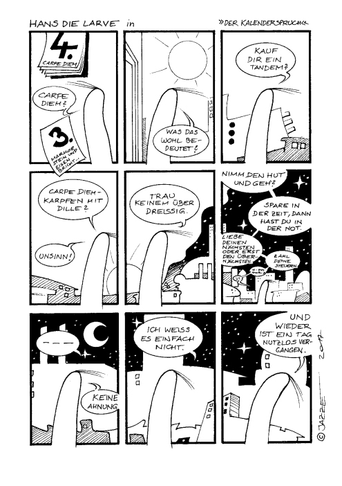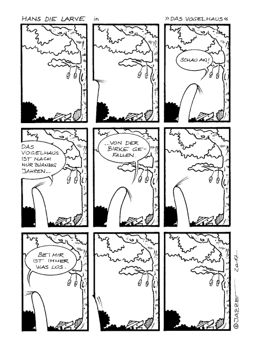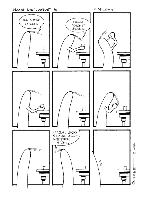 Und als kleine Larve hat man es nicht immer leicht, mit den Widrigkeiten des Alltags klar zu kommen - Vorallem, wenn man wie Hans zum Philosophieren neigt. Mit extrem reduziertem Strich und skurrilen Pointen hat das österreichische Comic-Urgestein Robert Jazze Niederle einen sympathischen und nachdenklichen Helden geschaffen, der seinesgleichen sucht.